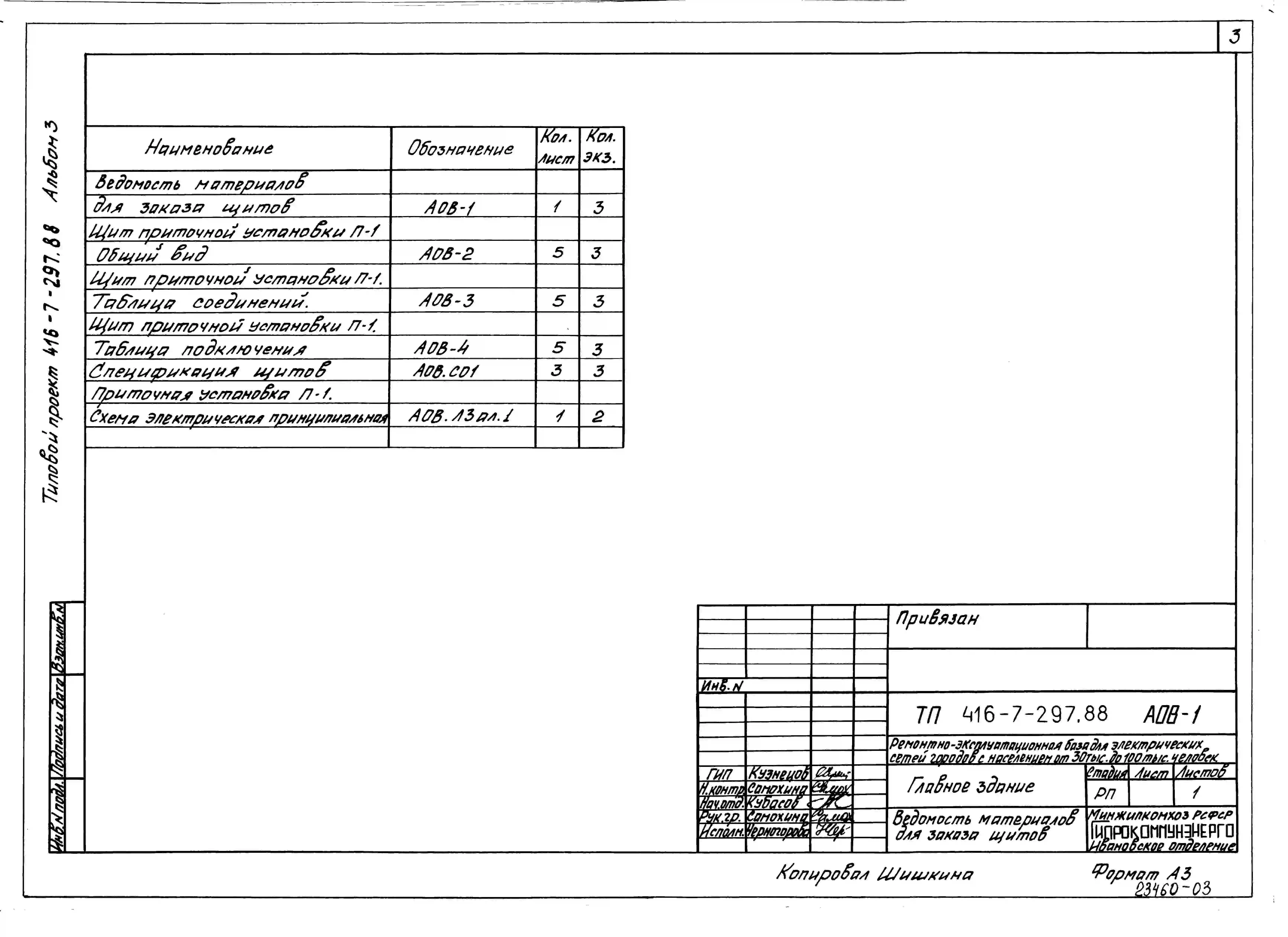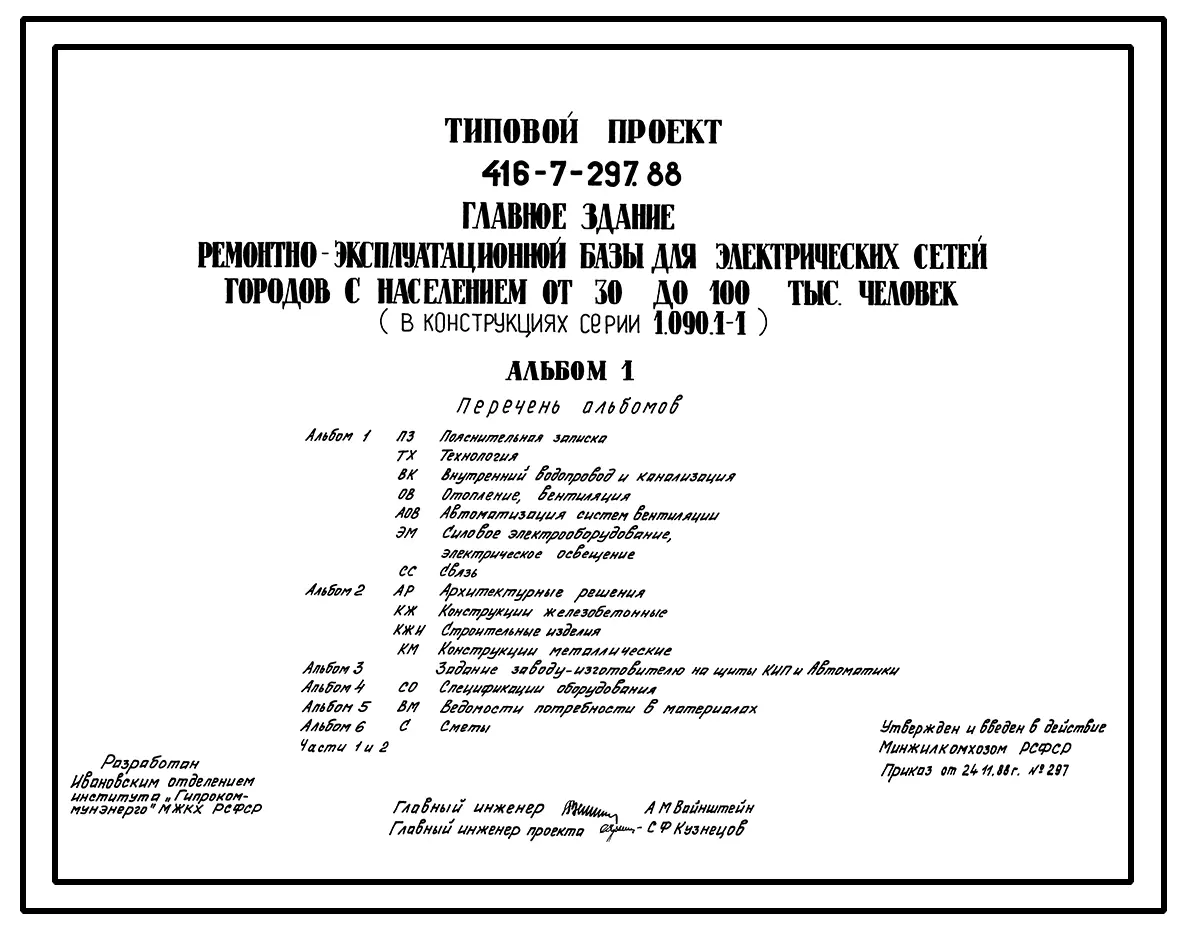 Типовой проект 416-7-297.88 Главное здание ремонтно-эксплуатационной базы для электрических сетей городов с населением от 30 до 100 тыс.человек ( в конструкциях серии 1.090.1-1).