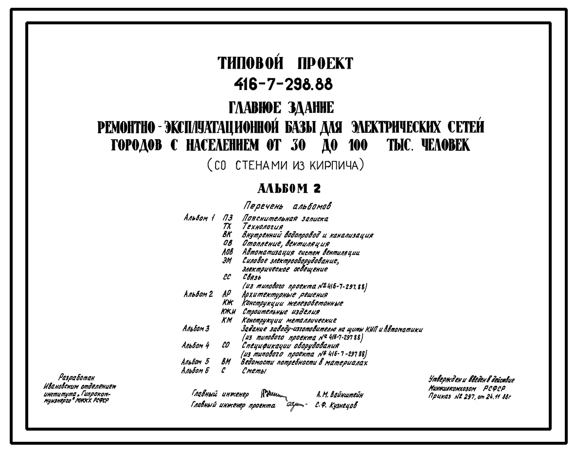 Типовой проект 416-7-298.88 Главное здание ремонтно-эксплуатационной базы для электрических сеией городов с населением от 30 до 100 тыс.человек (со стенами из кирпича).