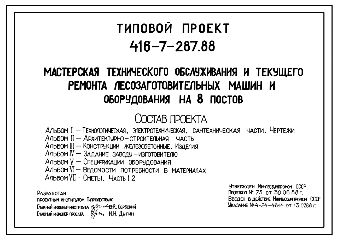 Типовой проект 416-7-287.88 Мастерская технического обслуживания и текущего ремонта лесозаготовительных машин и оборудования на 8 постов.