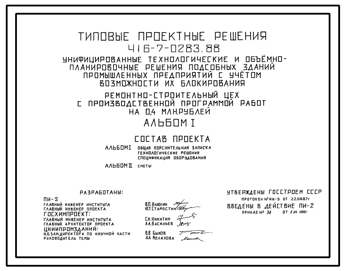 Типовой проект 416-7-0283.88 Ремонтно-строительных цех с производственной программой работ на 0,4 млн. руб.