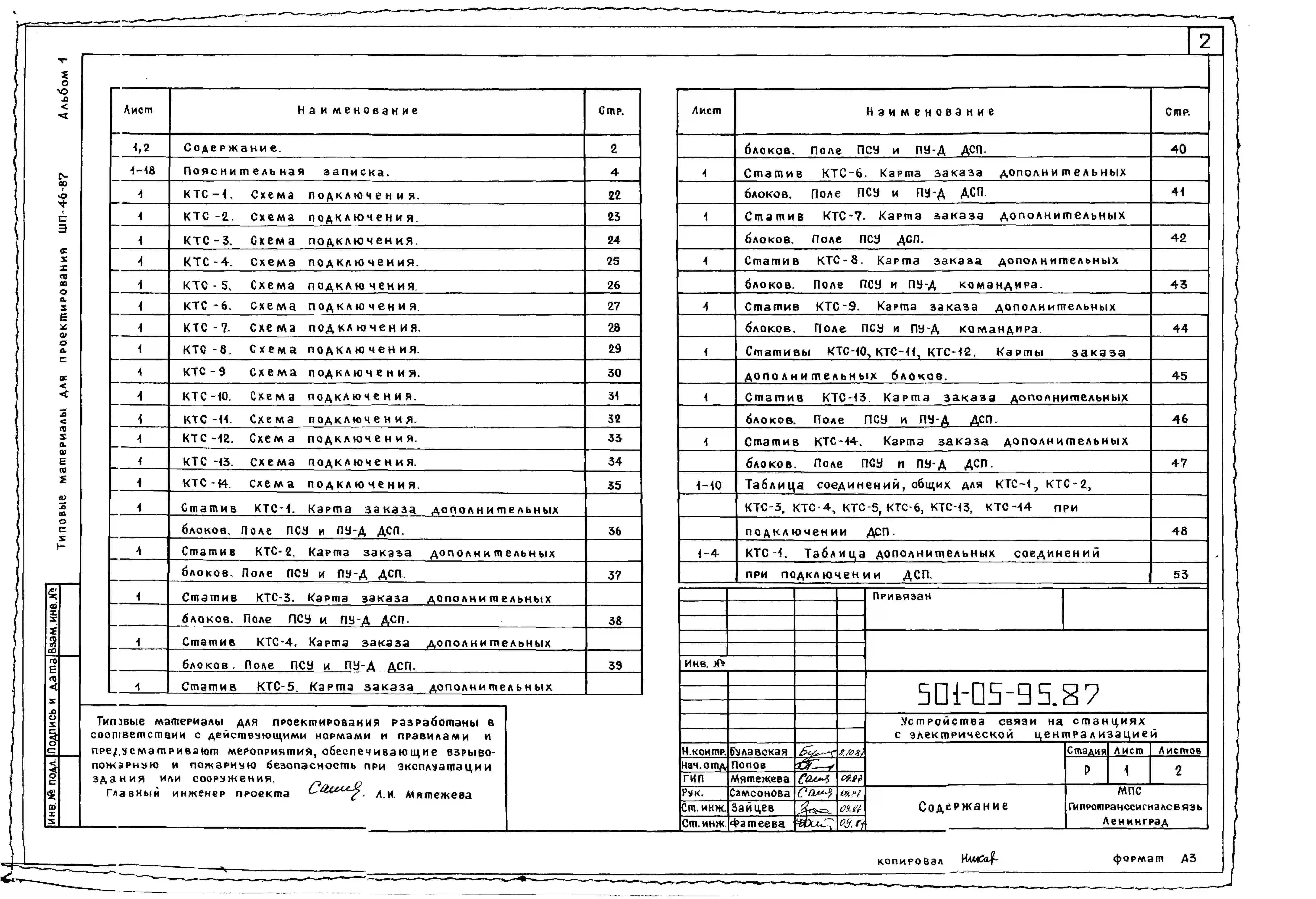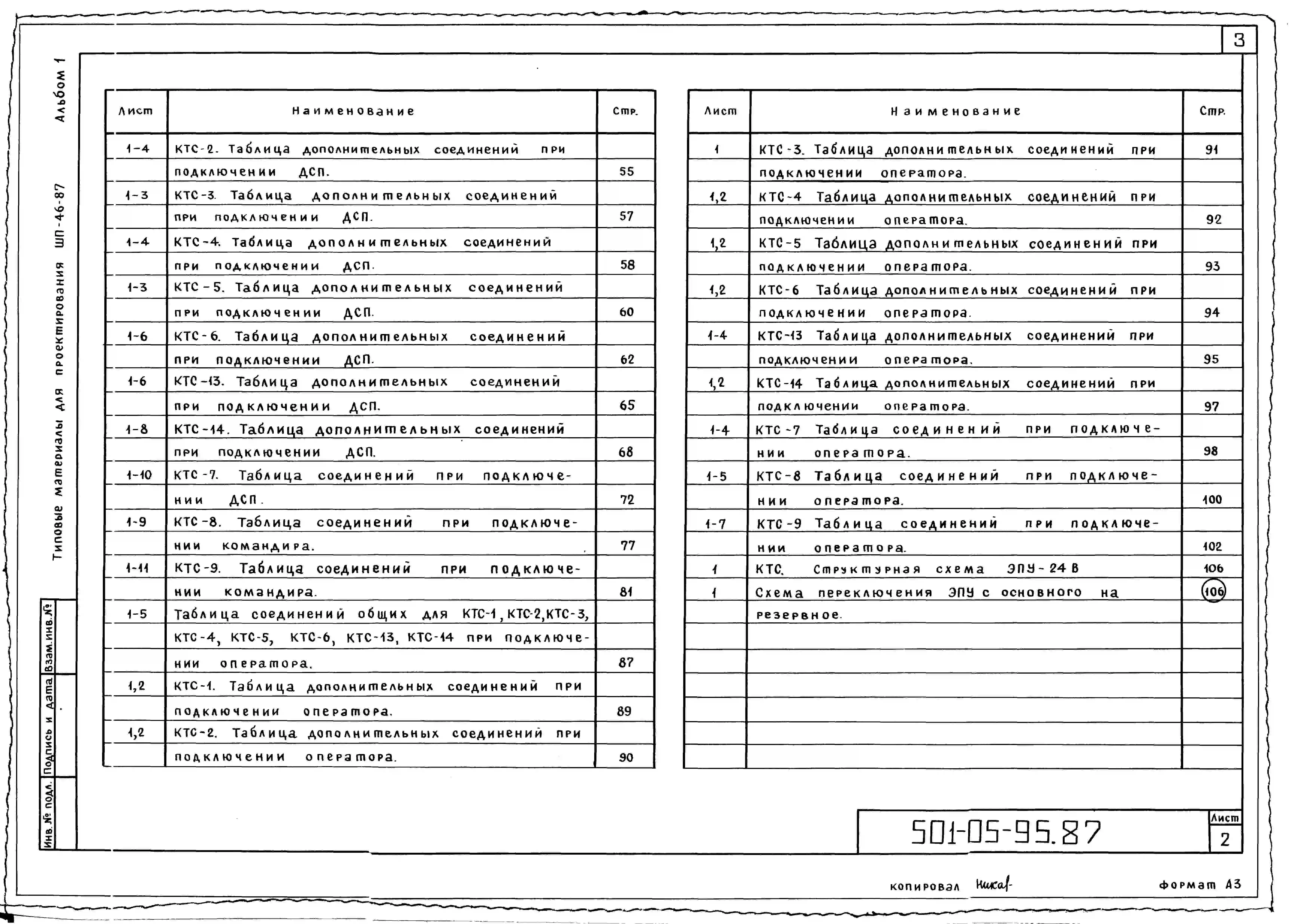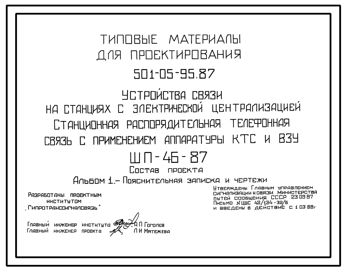 Типовой проект 501-05-95.87 Устройства связи на станциях с электрической централизацией. Станционная распорядительная телефонная связь с применением аппаратуры КТС и ВЗУ. ШП-46-87