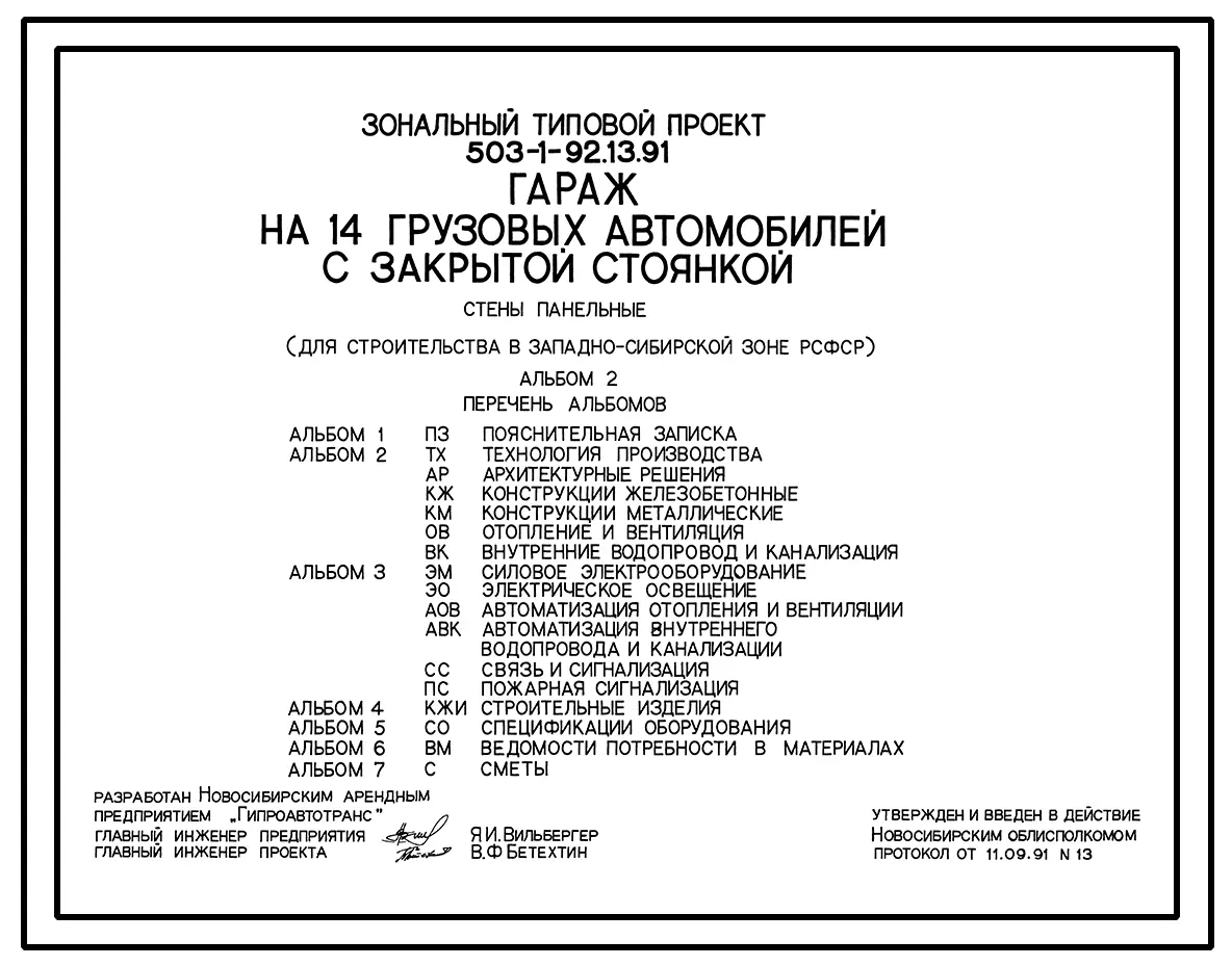 Типовой проект 503-1-92.13.91 Гараж на 14 грузовых автомобилей с закрытой стоянкой. Стены панельные (для строительства в Западно-Сибирской зоне РСФСР)