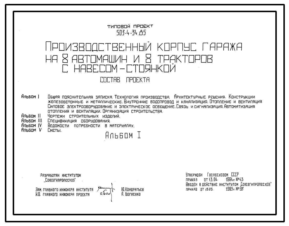 Типовой проект 503-4-34.85 Производственный корпус гаража на 8 автомашин и 8 тракторов с навесом-стоянкой