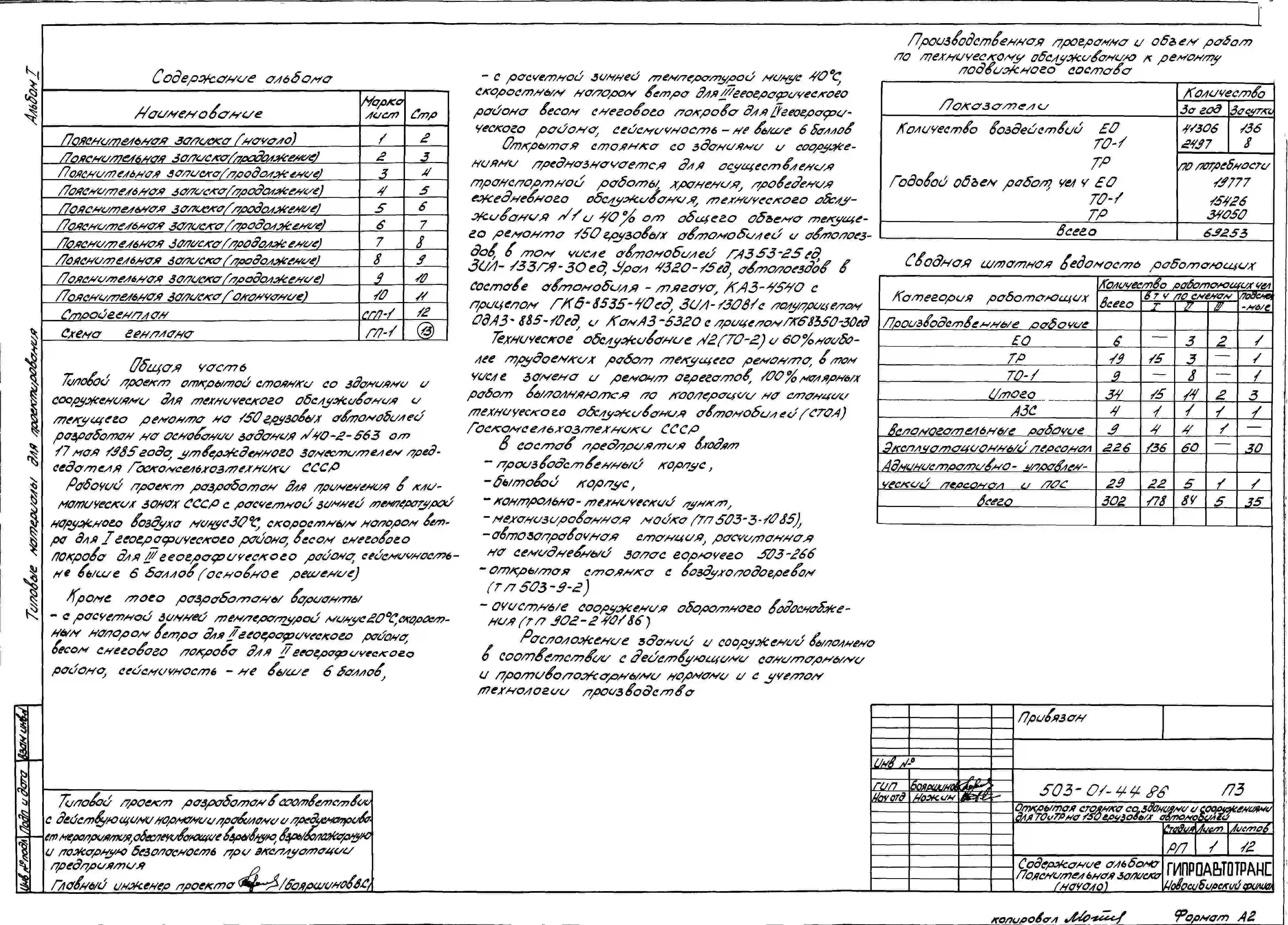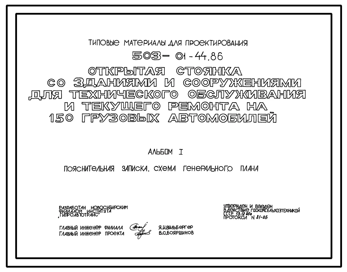 Типовой проект 503-01-44.86 Открытая стоянка со зданиями и сооружениями для технического обслуживания и текущего ремонта на 150 грузовых автомобилей