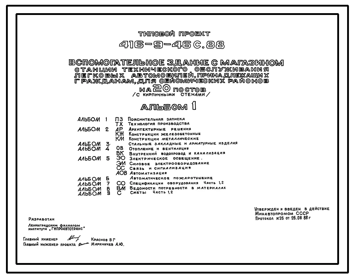 Типовой проект 416-9-46с.88 Вспомогательное здание с магазином станции технического обслуживания легковых автомобилей, принадлежащих гражданам, на 20 постов (стены из кирпича). Сейсмичность 8 баллов