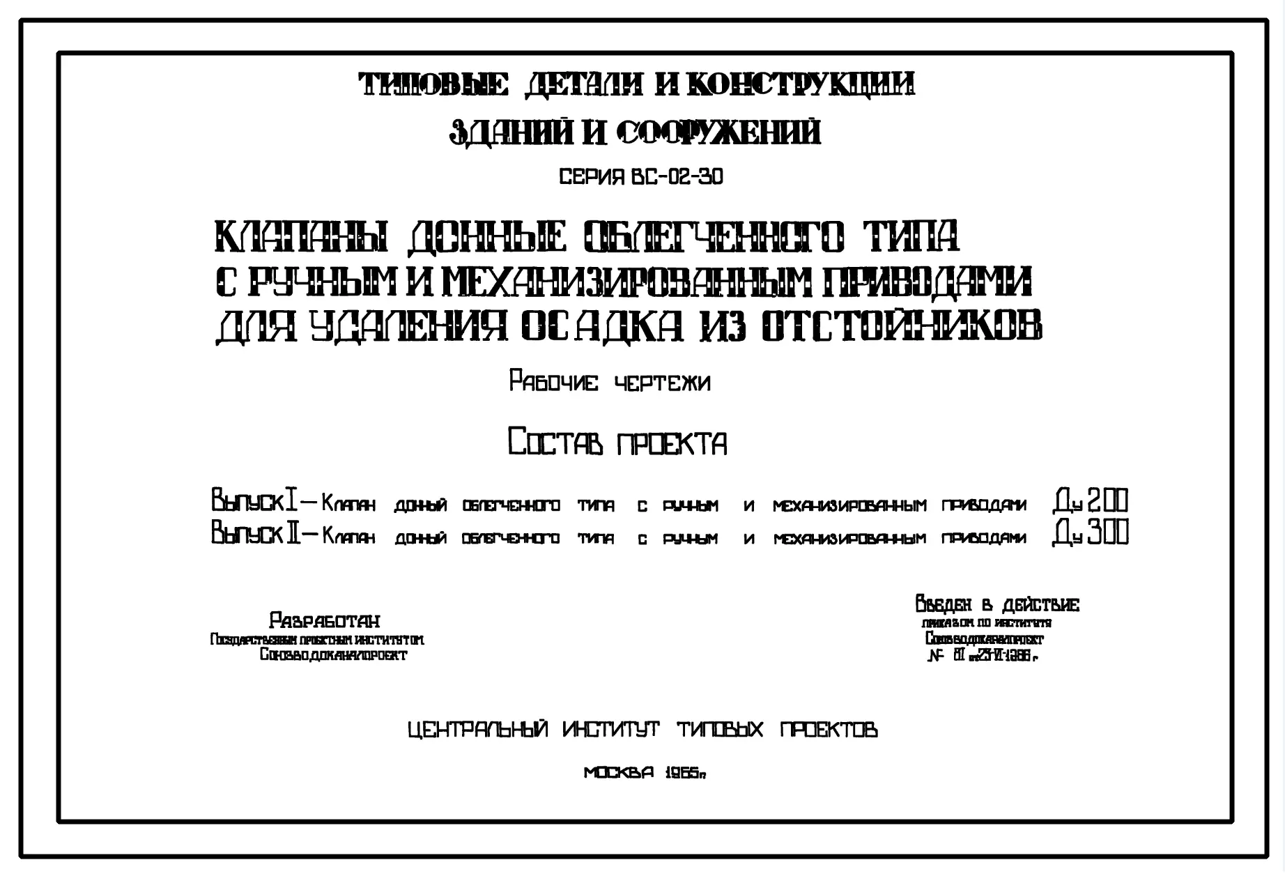 Серия ВС-02-30 Клапан донный облегченного типа с ручным и механизированным приводами Ду200 и Ду300. Рабочие чертежи.