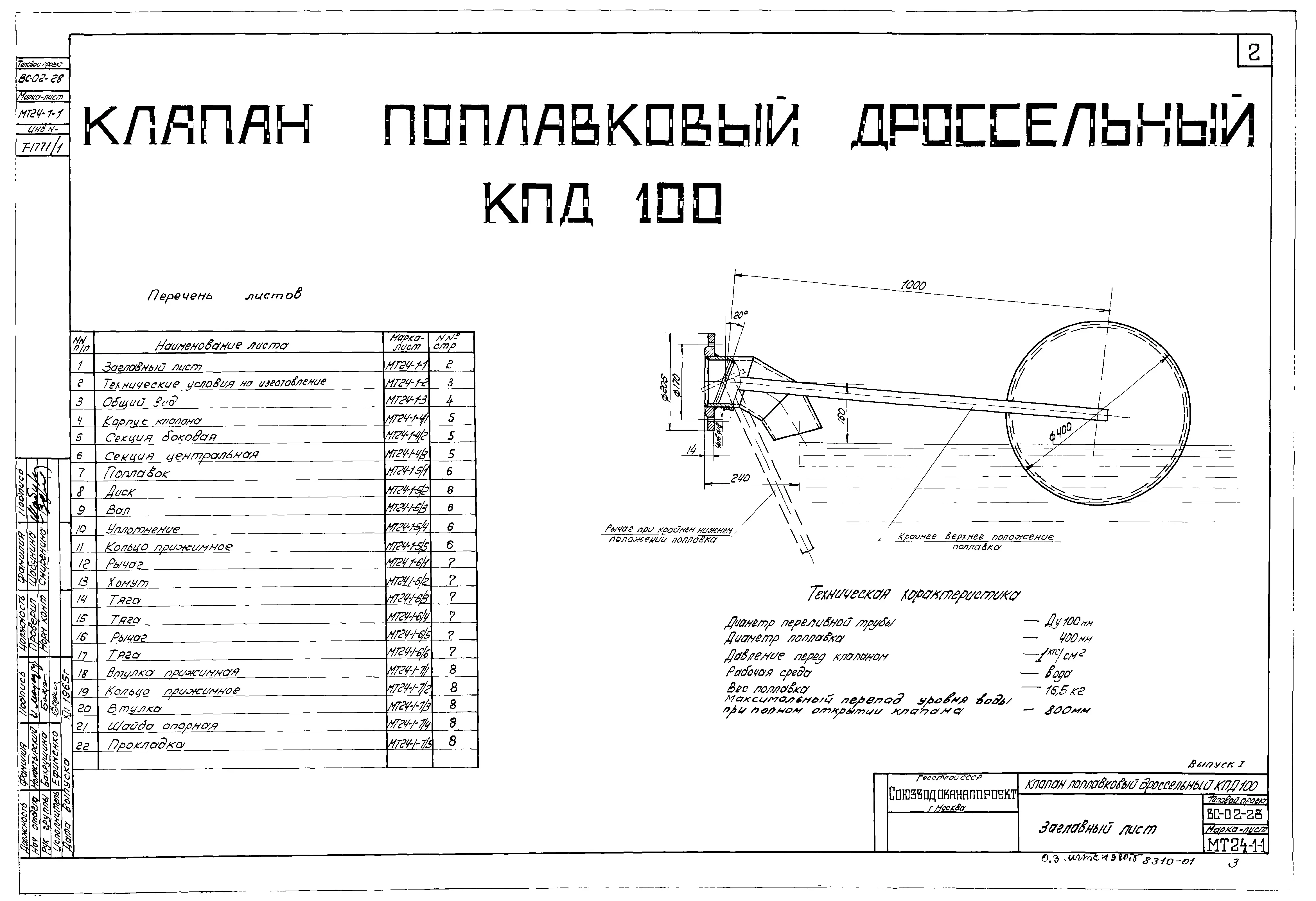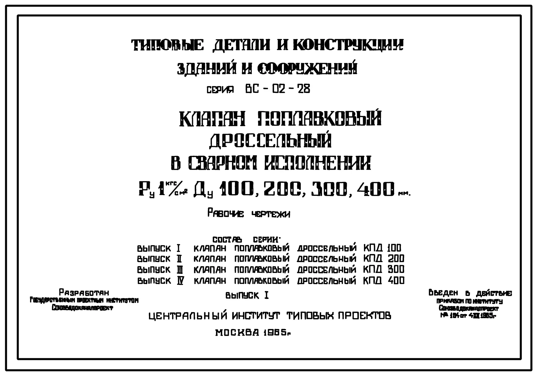 Серия ВС-02-28 Клапан поплавковый дроссельный в сварном исполнении Ру 1 кгс/ см.кв Ду100 ,200, 300,400. Рабочие чертежи.