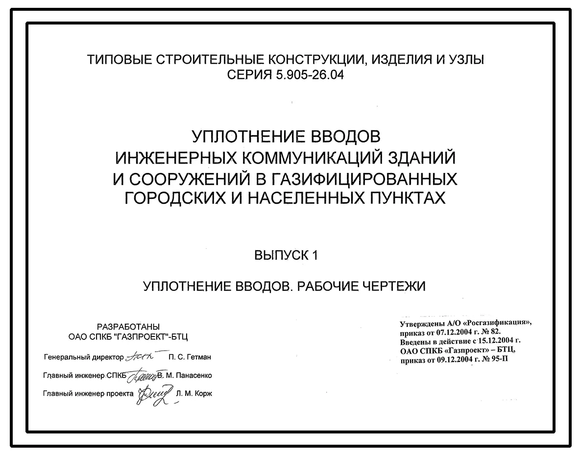 Серия 5.905-26.04 Уплотнение вводов инженерных коммуникаций зданий и сооружений в газифицированных городских и населенных пунктах. Рабочие чертежи.