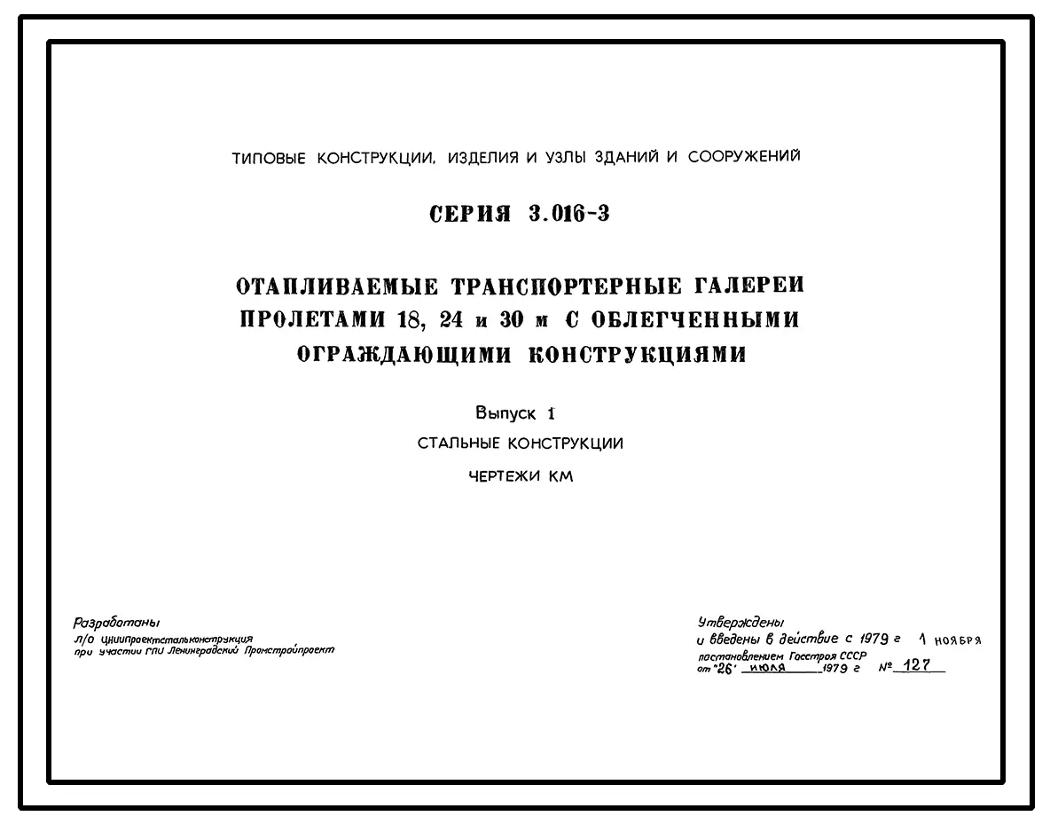 Серия 3.016-3 Отапливаемые транспортерные галереи пролетами 18, 24 и 30 м с облегченными ограждающими конструкциями. Материалы для проектирования и рабочие чертежи.