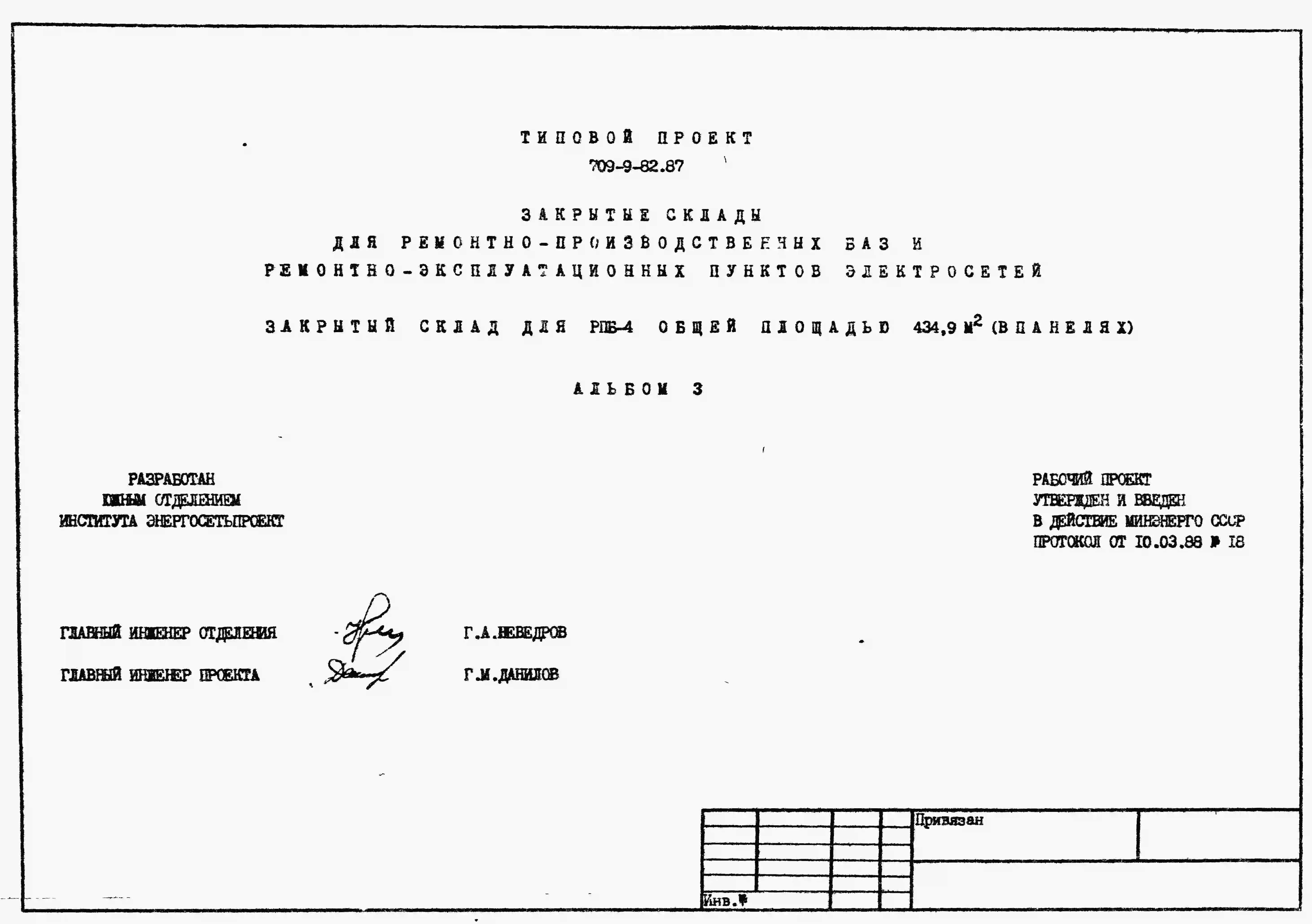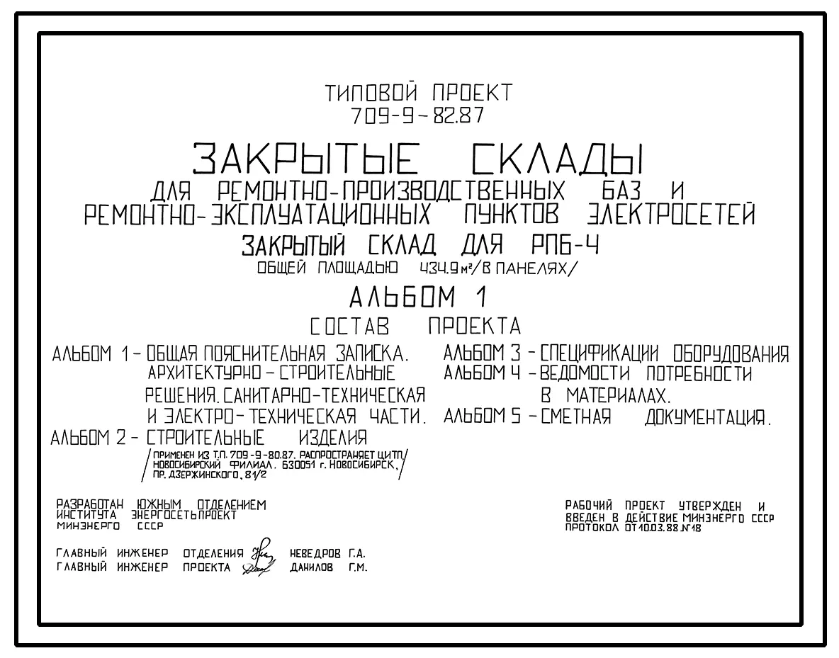 Типовой проект 709-9-82.87 Закрытые склады для ремонтно-производственных баз и ремонтно-эксплуатационных пунктов электросетей. Закрытый склад для РПБ-4 общей площадью 434 м2 (в панелях)