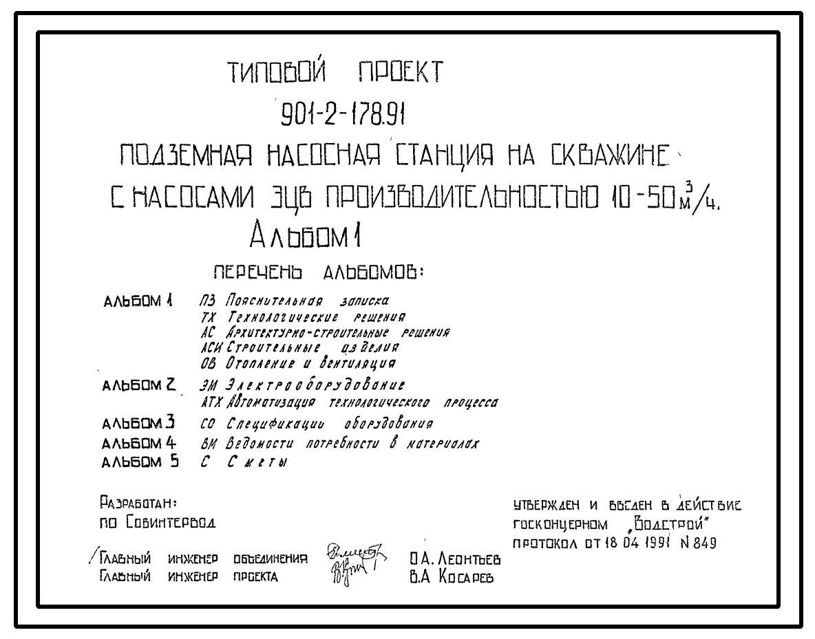 Типовой проект 901-2-178.91 Подземная насосная станция с насосами ЭЦВ производительностью 10–50 м3/ч