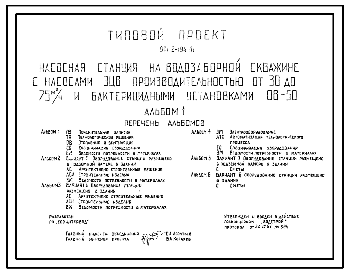 Типовой проект 901-2-194.91 Насосная станция на водозаборной скважине с насосами ЭЦВ производительностью от 30 до 75 м3/ч и бактерицидными установками ОВ-50