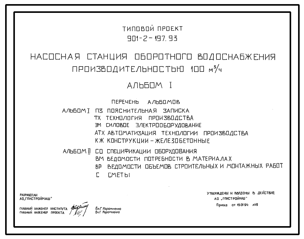 Типовой проект 901-2-197.93 Насосная станция оборотного водоснабжения производительностью 100 м3/ч