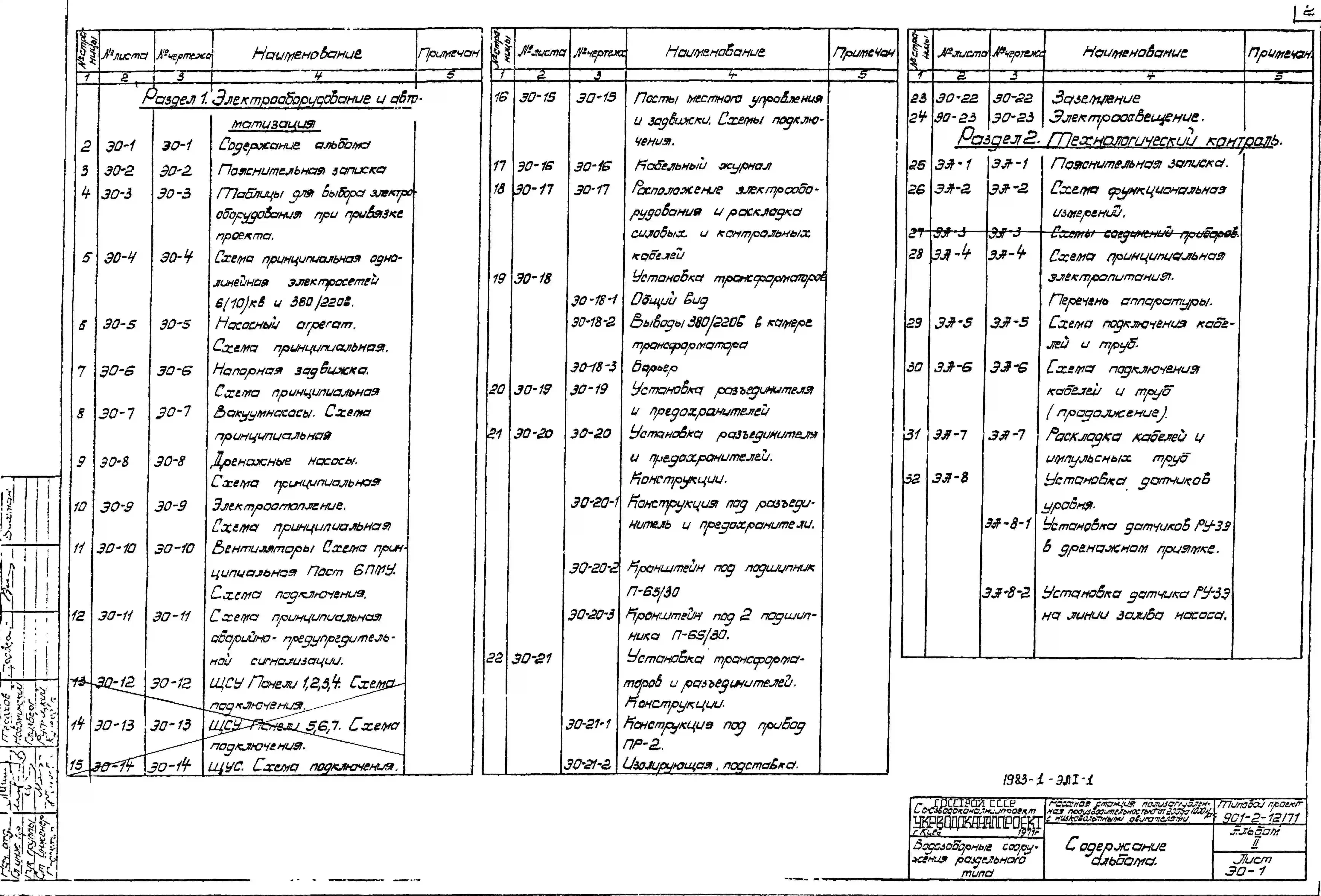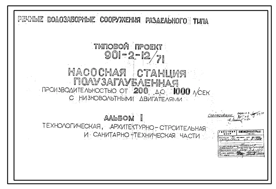 Типовой проект 901-2-12/71 Речные водозоборные сооружения раздельного типа. Насосная станция полузаглубленная производительностью от 200 до 1000 л/сек с низковольтными двигателями