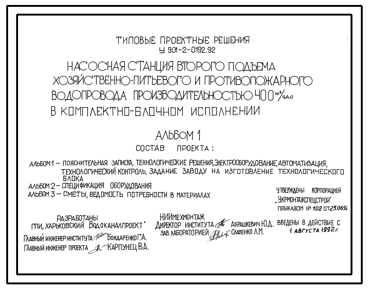 Типовой проект У.901-2-0192.92 Насосная станция второго подъема хозяйственно-питьевого и противопожарного водопровода производительностью 400 м3/ч в комплектно-блочном исполнении