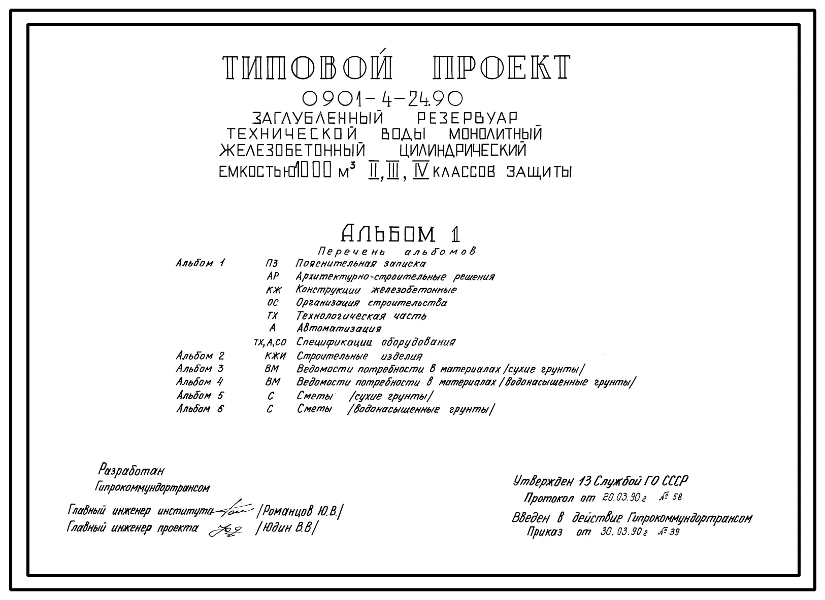 Типовой проект 0901-4-24.90 Заглубленный резервуар технической воды монолитный железобетонный цилиндрической емкостью 1000 м3 II, III, IV классов защиты