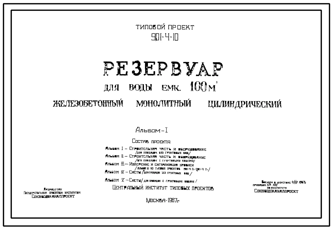 Типовой проект 901-4-10 Резервуар для воды емкостью 100 м.куб. железобетонный монолитный цилиндрический