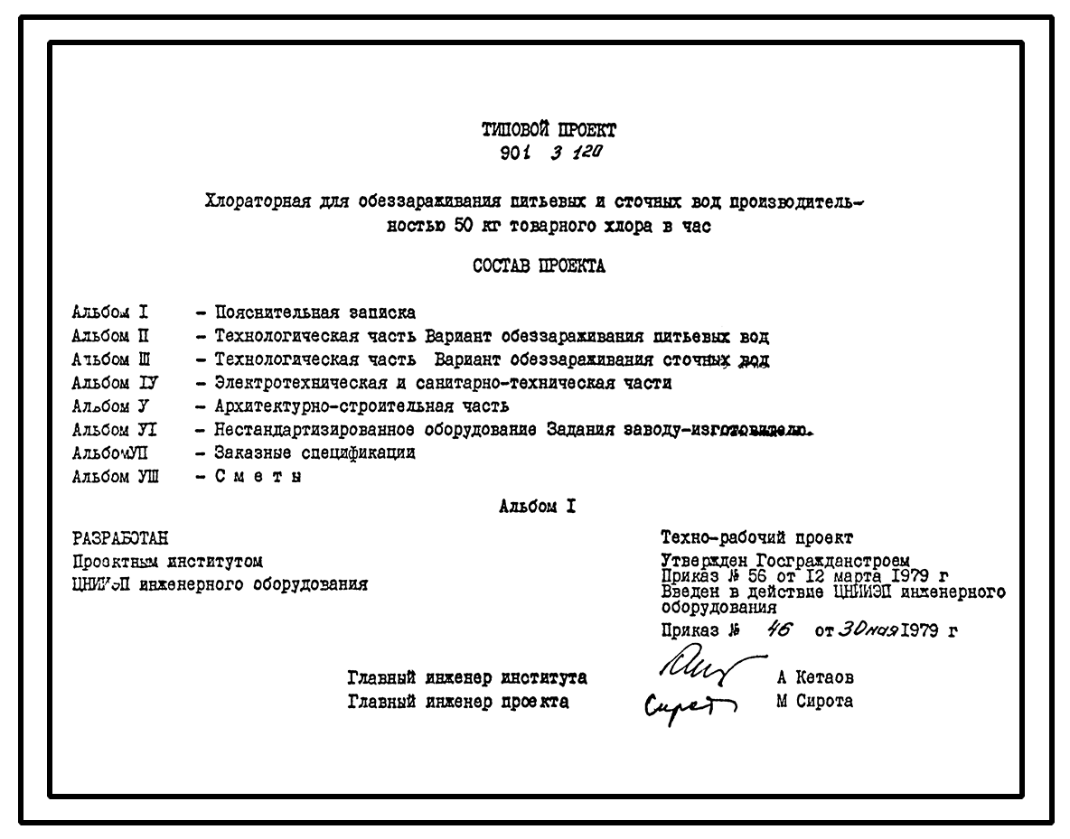 Типовой проект 901-3-120 Хлораторная для обеззараживания питьевых и сточных вод производительностью 50 кг товарного хлора в час