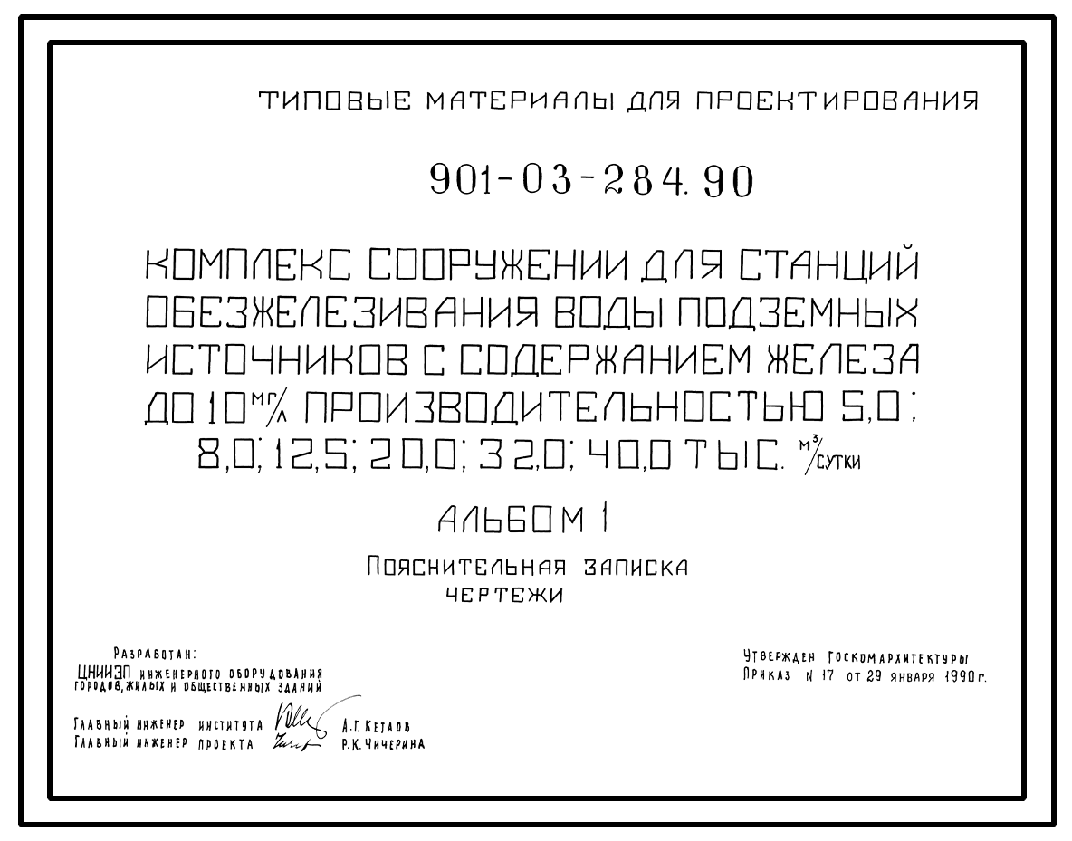 Типовой проект 901-03-284.90 Комплекс сооружений для станции обезжелезивания воды подземных источников с содержанием железа до 10 мг/л производительностью 5,0; 8,0; 12,5; 20,0; 32,0; 40,0 тыс.м3/сут