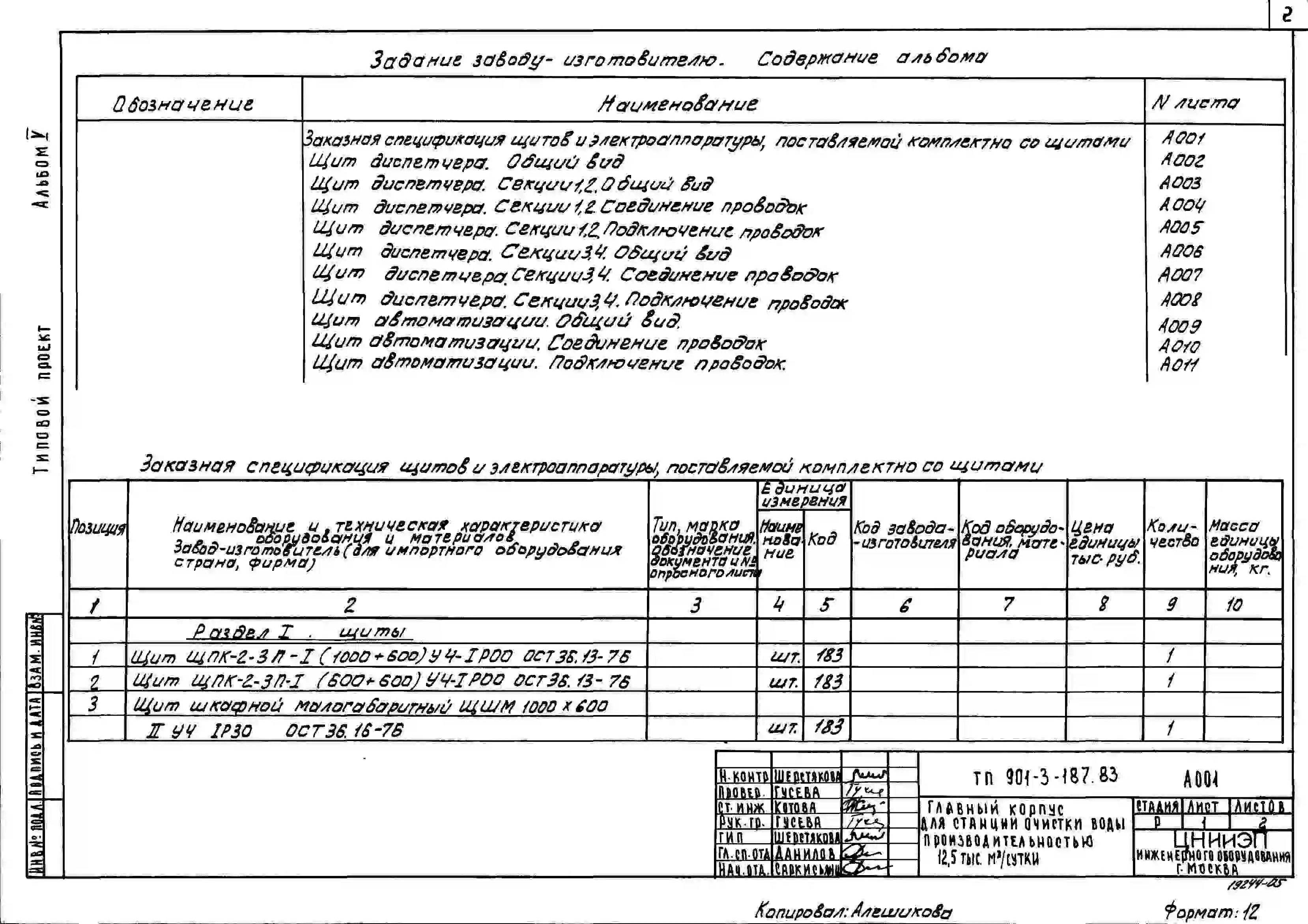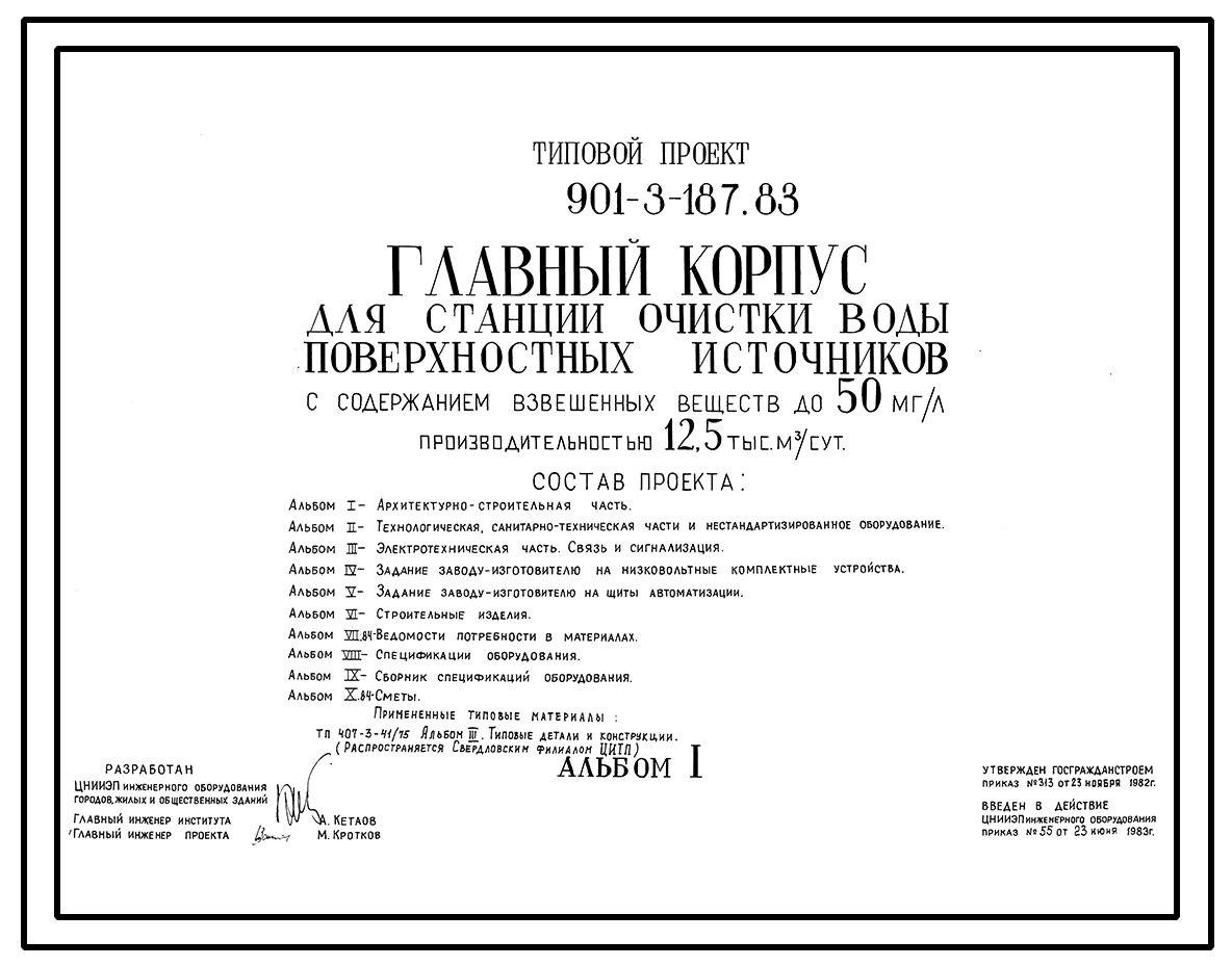 Типовой проект 901-3-187.83 Главный корпус для станции очистки воды поверхностных источников с содержанием взвешенных веществ до 50 мг/л производительностью 12,5 тыс. м3/сут