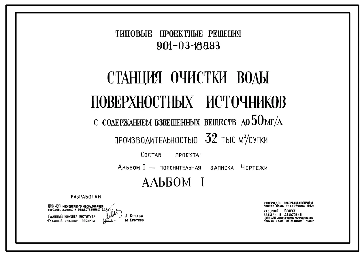 Типовой проект 901-03-189.83 Станция очистки воды поверхностных источников с содержанием взвешенных веществ до 50 мг/л производительностью 32 тыс. м3/сут
