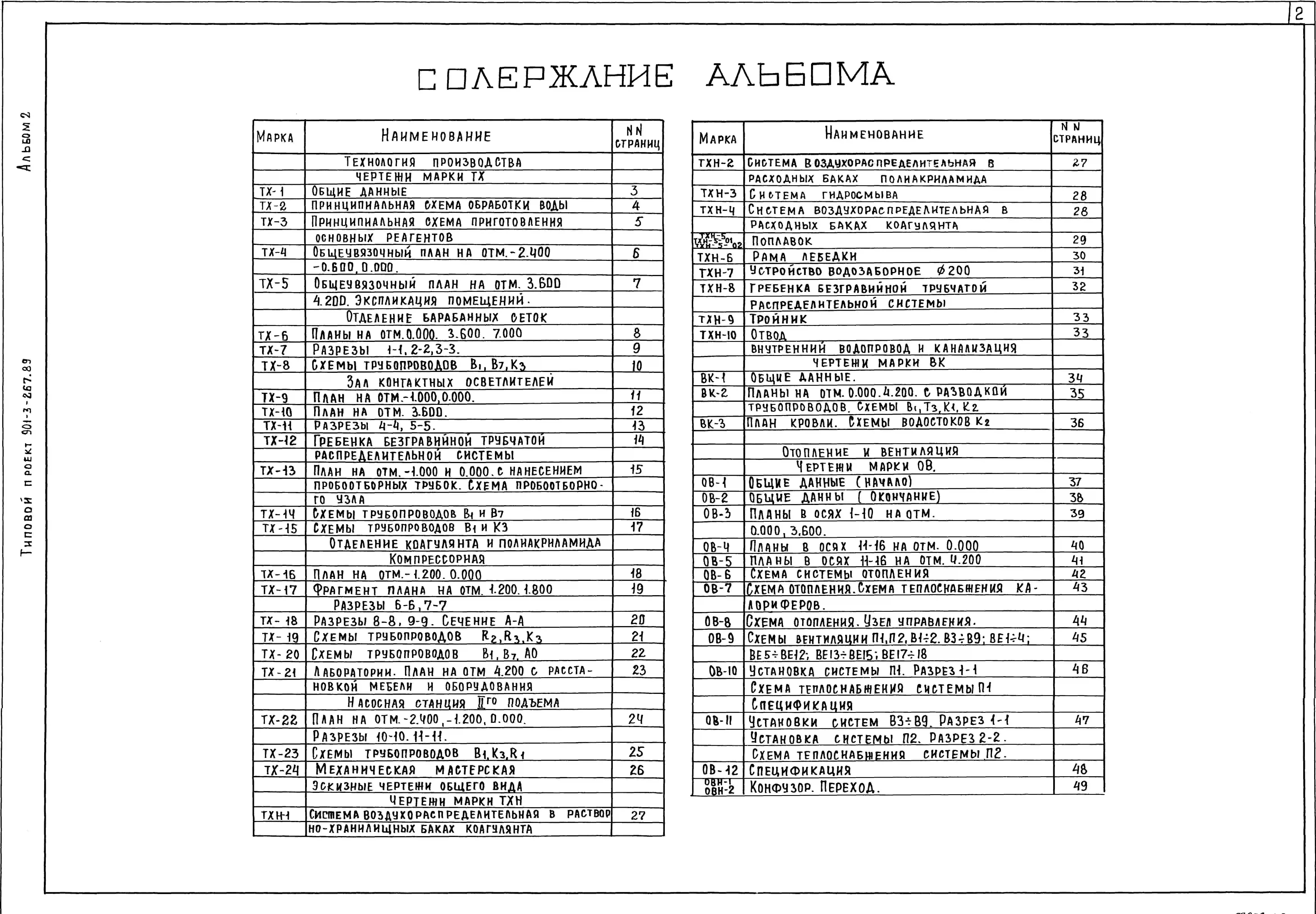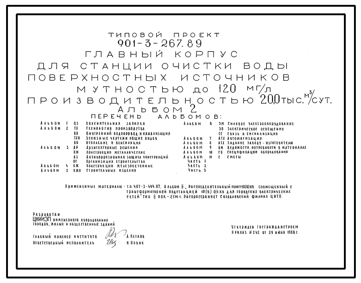 Типовой проект 901-3-267.89 Главный корпус для станции очистки воды поверхностных источников мутностью до 120 мг/л производительностью 20,0 тыс. м3/сут