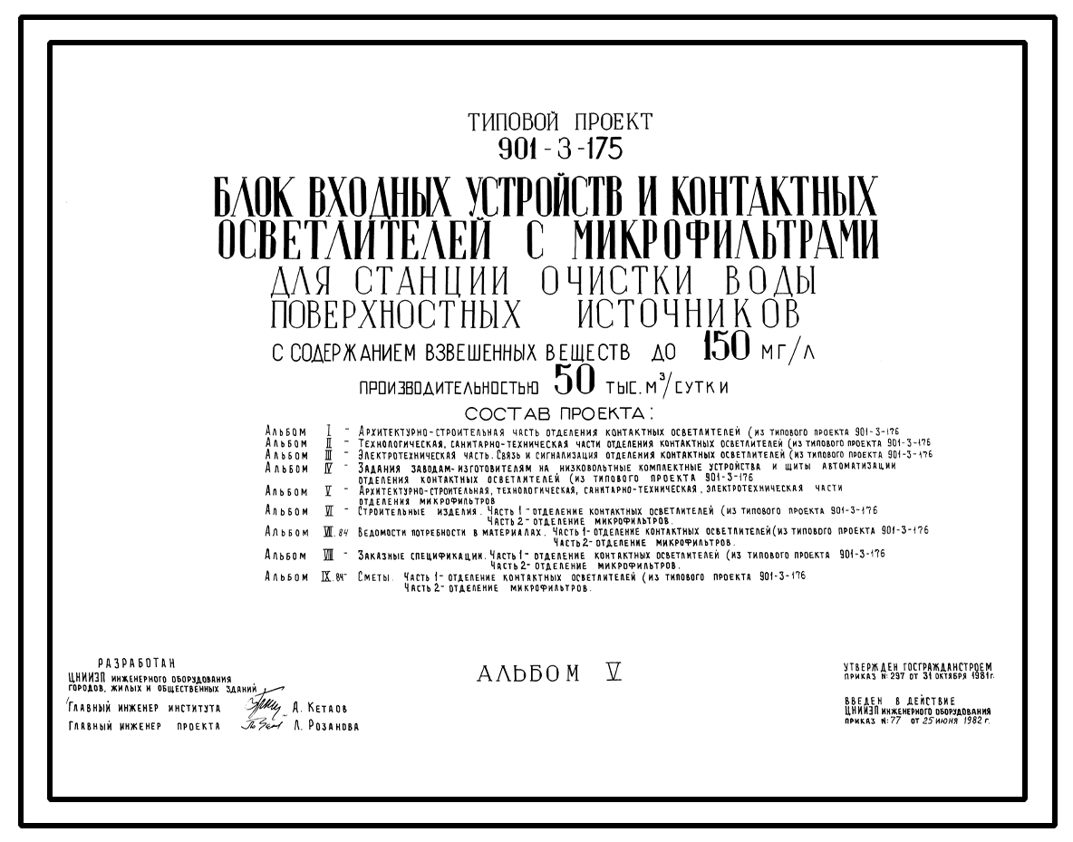 Типовой проект 901-3-175 Блок входных устройств и контактных осветлителей с микрофильтрами для станции очистки воды поверхностных источников с содержанием взвешенных веществ до 150 мг/л производительностью 50 тыс. м3/сут