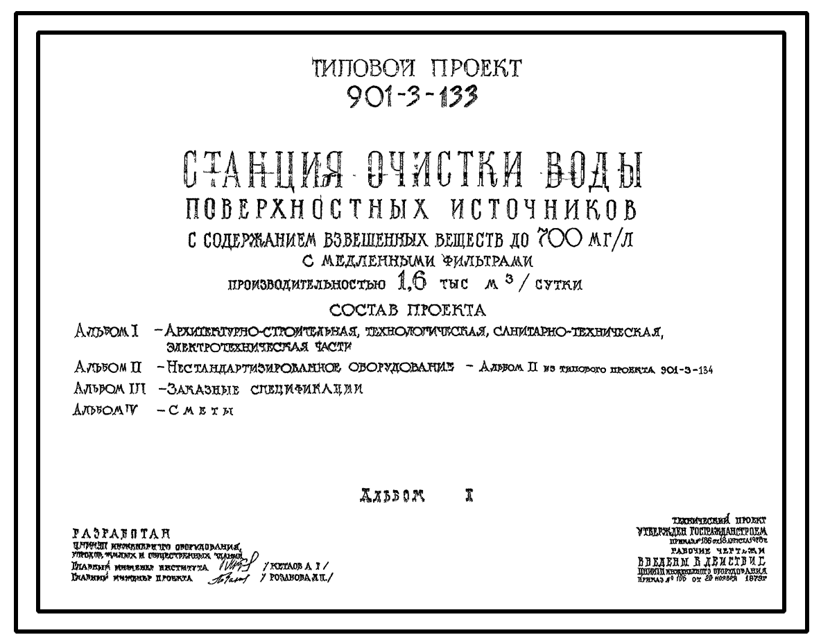Типовой проект 901-3-133 Станция очистки воды поверхностных источников с содержанием взвешенных веществ до 700 мг/л с медленными фильтрами производительностью 1,6 тыс. м3/сут