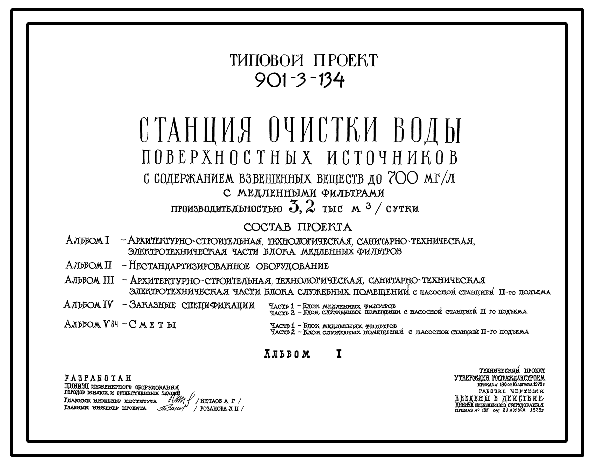 Типовой проект 901-3-134 Станция очистки воды поверхностных источников с содержанием взвешенных веществ до 700 мг/л с медленными фильтрами производительностью 3,2 тыс. м3/сут
