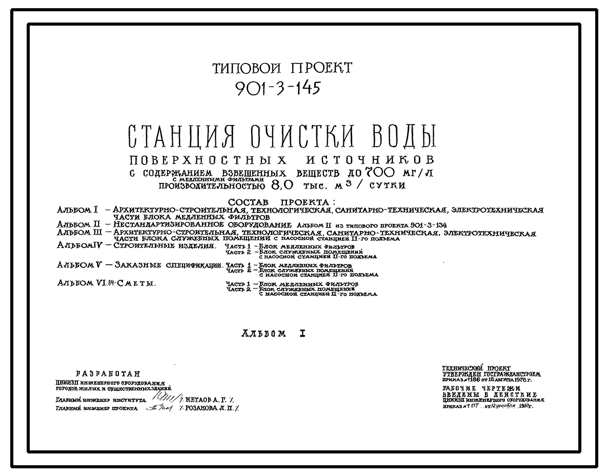 Типовой проект 901-3-145 Станция очистки воды поверхностных источников с содержанием взвешенных веществ до 700 мг/л с медленными фильтрами производительностью 8,0 тыс. м3/сут