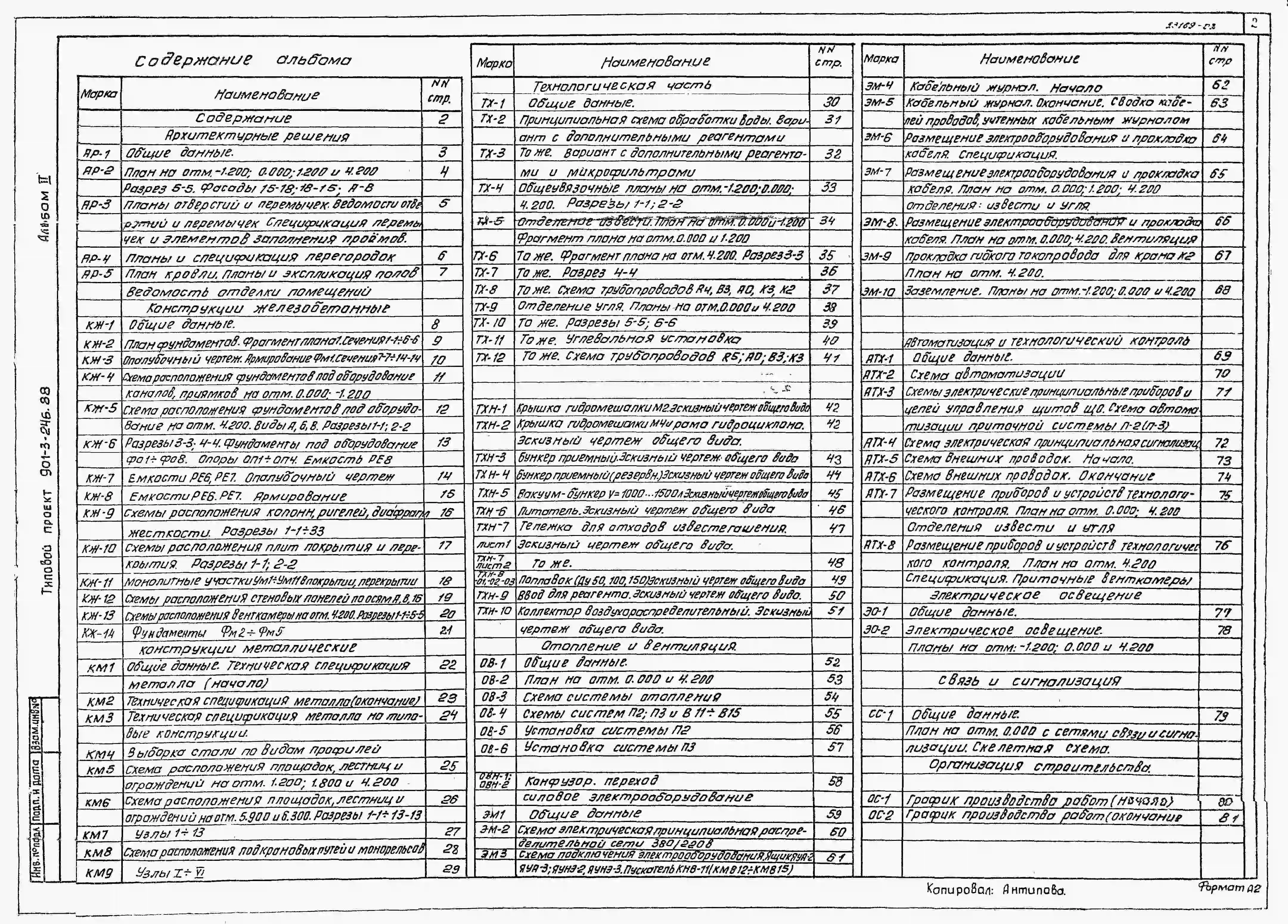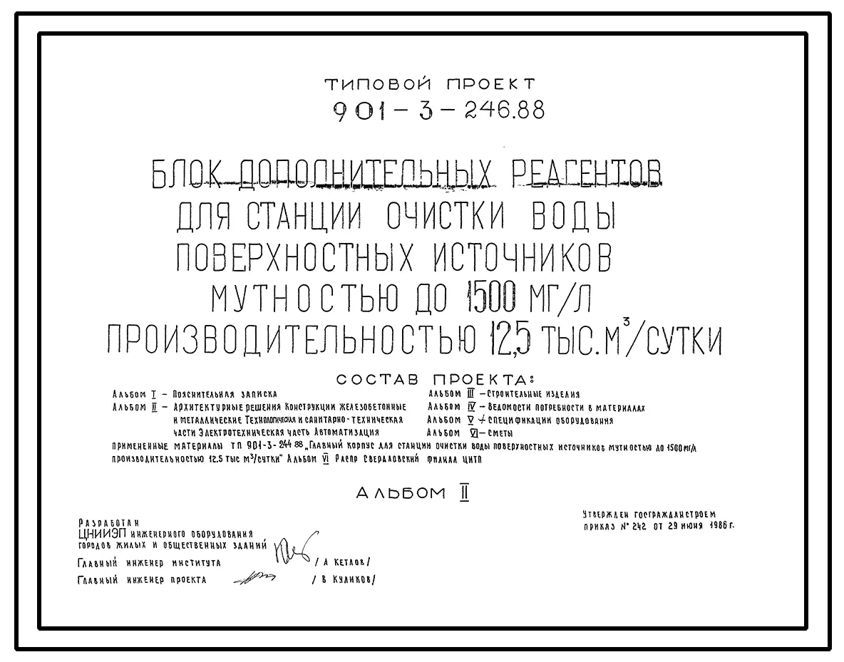Типовой проект 901-3-246.88 Блок дополнительных реагентов для станции очистки воды поверхностных источников мутностью до 1500 мг/л, производительностью 12,5 тыс. м3/сут