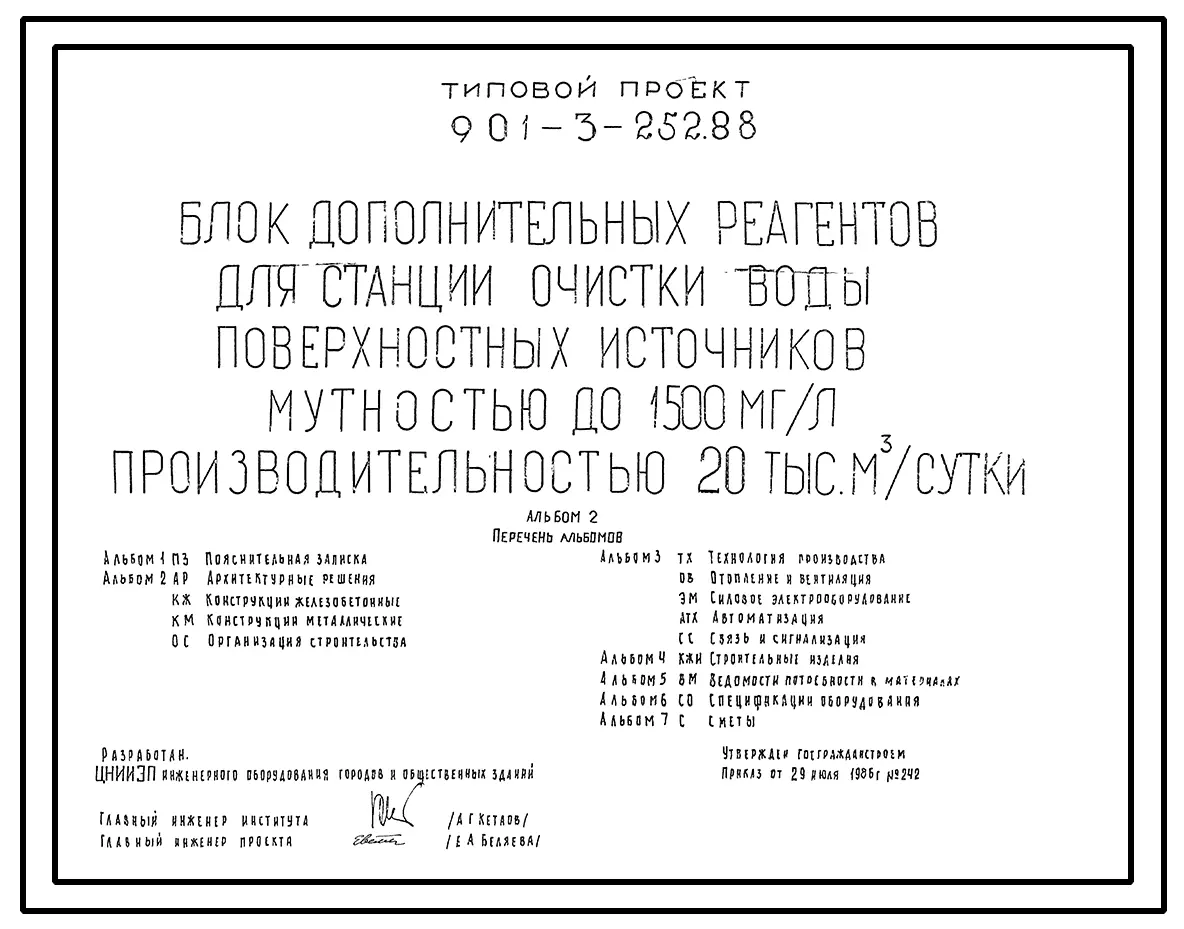 Типовой проект 901-3-252.88 Блок дополнительных реагентов для станции очистки воды поверхностных источников мутностью до 1500 мг/л, производительностью 20,0 тыс. м3/сут