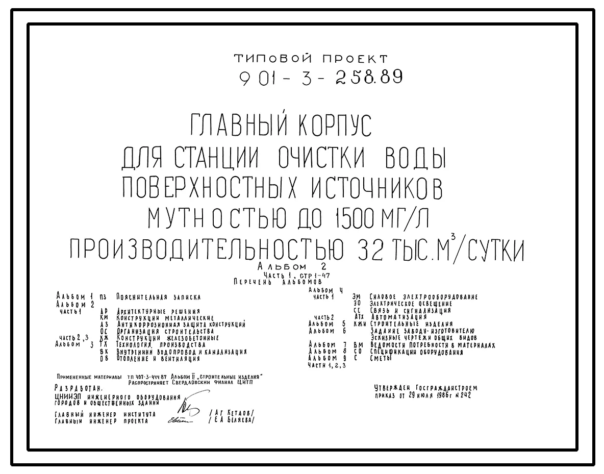 Типовой проект 901-3-258.89 Главный корпус для станции очистки воды поверхностных источников мутностью до 1500 мг/л, производительностью 32,0 тыс. м3/сут