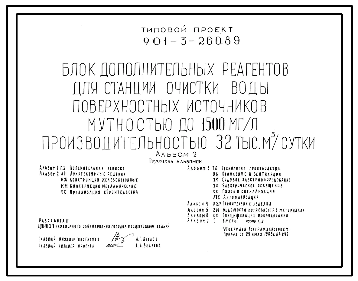 Типовой проект 901-3-260.89 Блок дополнительных реагентов для станции очистки воды поверхностных источников мутностью до 1500 мг/л, производительностью 32,0 тыс. м3/сут