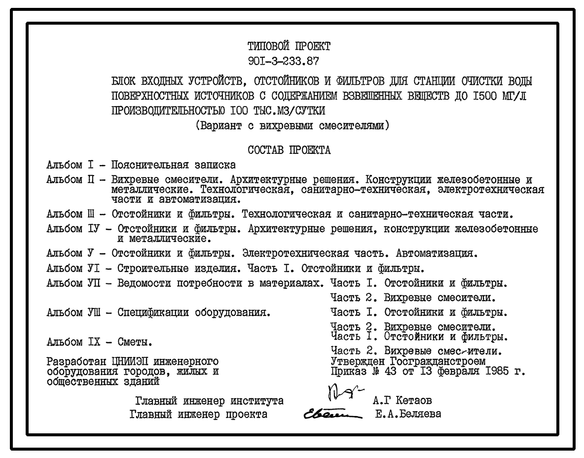 Типовой проект 901-3-233.87 Блок входных устройств, отстойников и фильтров для станции очистки воды поверхностных источников с содержанием взвешенных веществ до 1500 мг/л производительностью 100 тыс. м3/сут (вариант с вихревыми смесителями)