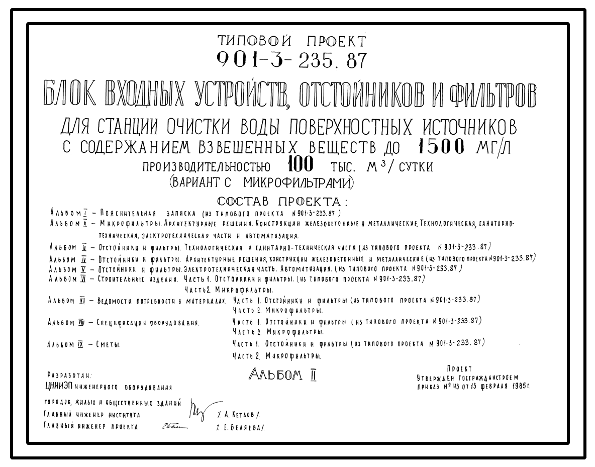 Типовой проект 901-3-235.87 Блок входных устройств, отстойников и фильтров для станции очистки воды поверхностных источников с содержанием взвешенных веществ до 1500 мг/л производительностью 100 тыс. м3/сут (вариант с микрофильтрами)