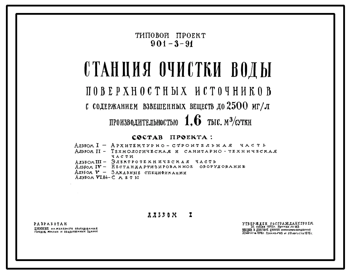 Типовой проект 901-3-91 Станция очистки воды поверхностных источников с содержанием взвешенных веществ до 2500 мг/л производительностью 1,6 тыс. м3/сут