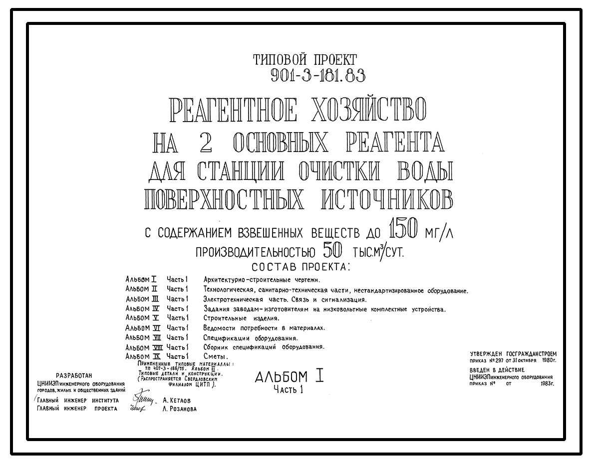 Типовой проект 901-3-181.83 Реагентное хозяйство на 2 основных реагента для станции очистки воды поверхностных источников с содержанием взвешенных веществ до 150 мг/л производительностью 50 тыс. м3/сут