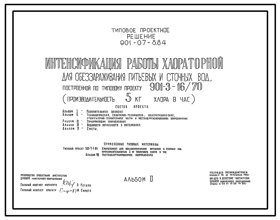 Типовой проект 901-07-8.84 Интенсификация работы хлораторной для обеззараживания питьевых и сточных вод, построенной по типовому проекту 901-3-16/70 (производительностью 5 кг хлора в час)
