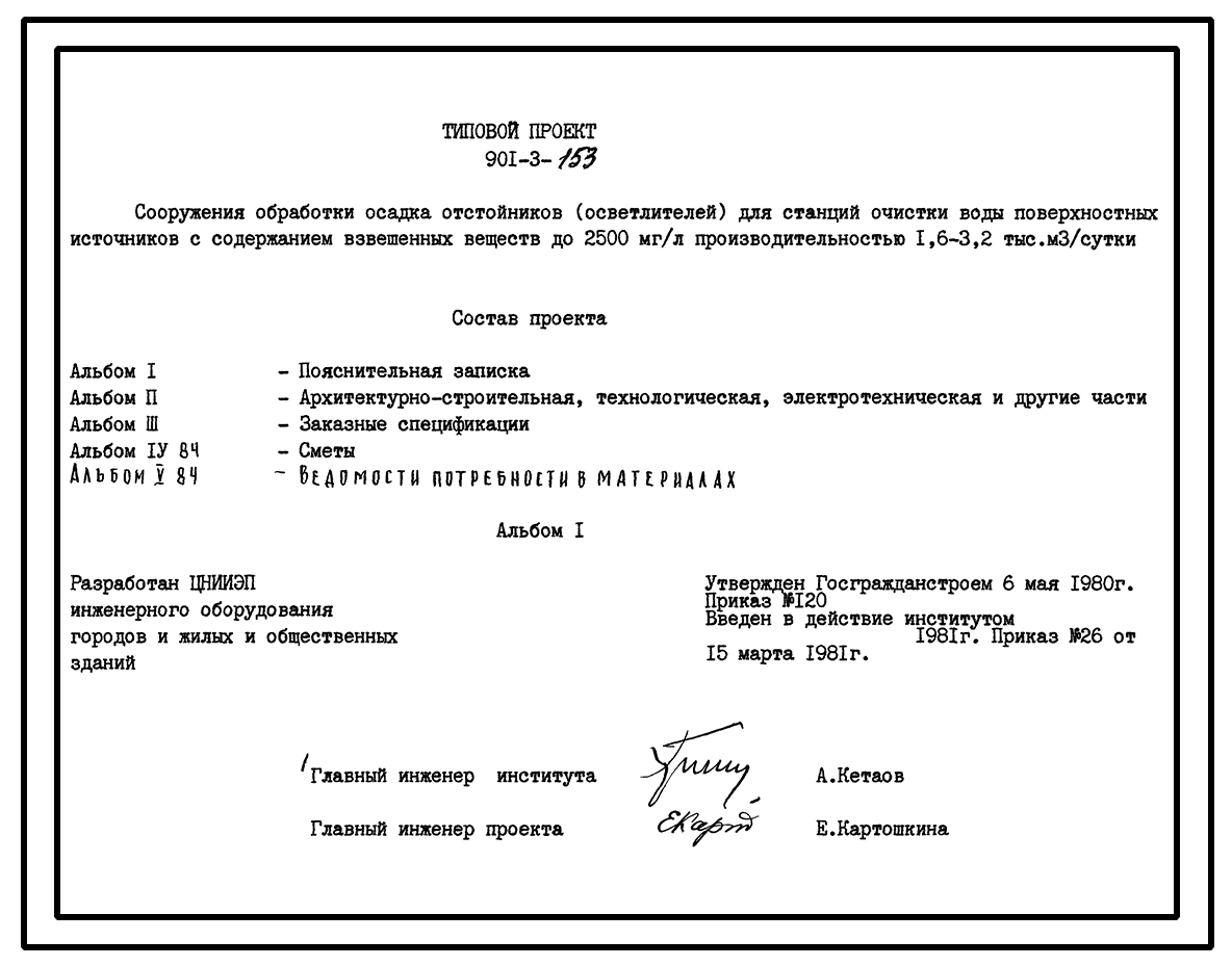 Типовой проект 901-3-153 Сооружения обработки осадка отстойников (осветлителей) для станции очистки воды поверхностных источников с содержанием взвешенных веществ до 2500 мг/л производительностью 1,6–3,2 тыс. м3/сут