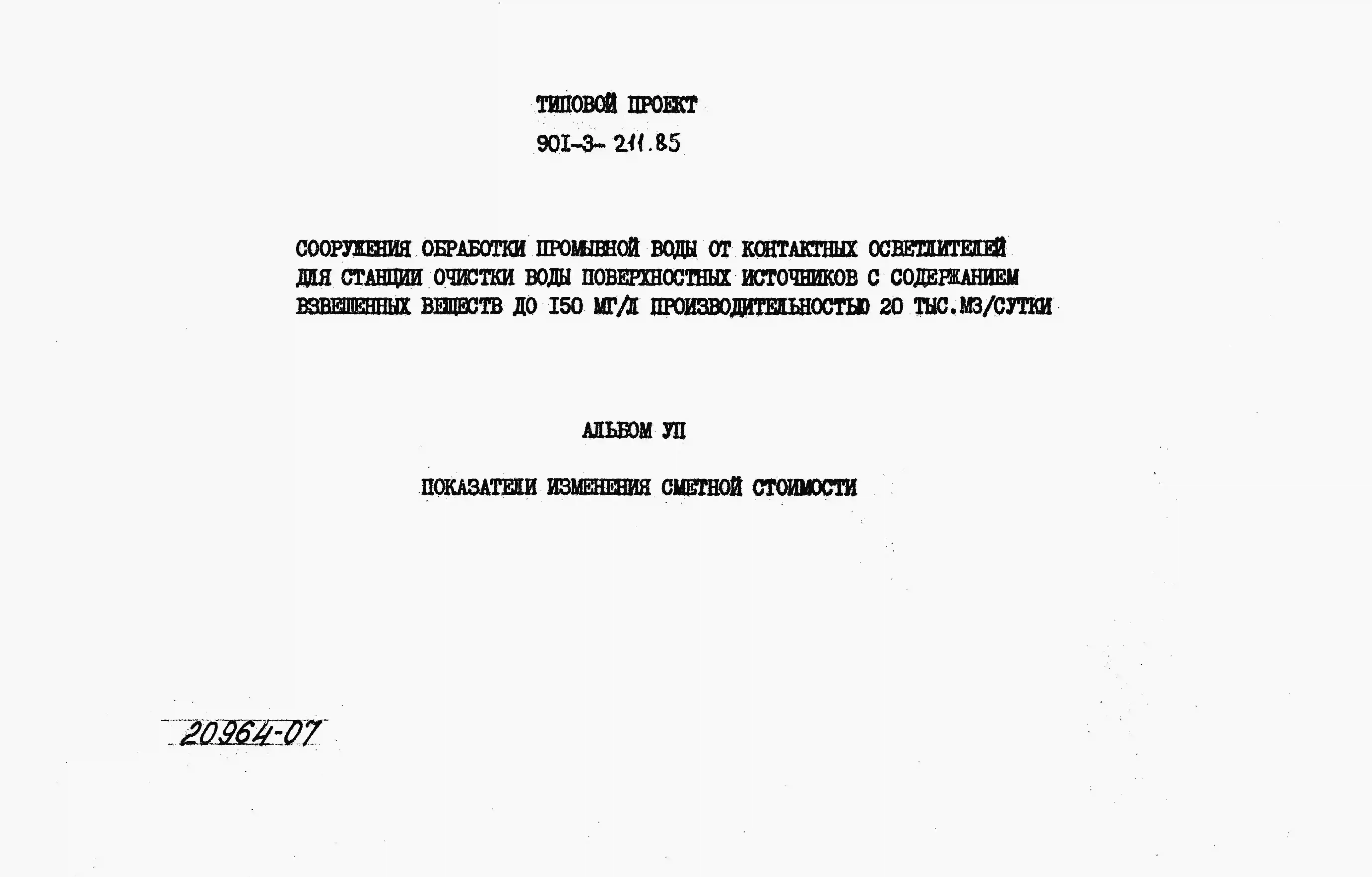 Типовой проект 901-3-211.85 Сооружения обработки промывной воды от контактных осветлителей для станции очистки воды поверхностных источников с содержанием взвешенных веществ до 150 мг/л производительностью 20,0 тыс. м3/сут