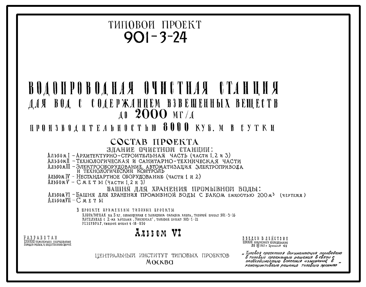Типовой проект 901-3-24 Водопроводная очистная станция для вод с содержанием взвешенных веществ от 500 до 2000 мг/л производительностью 8,0 тыс. м3/сут