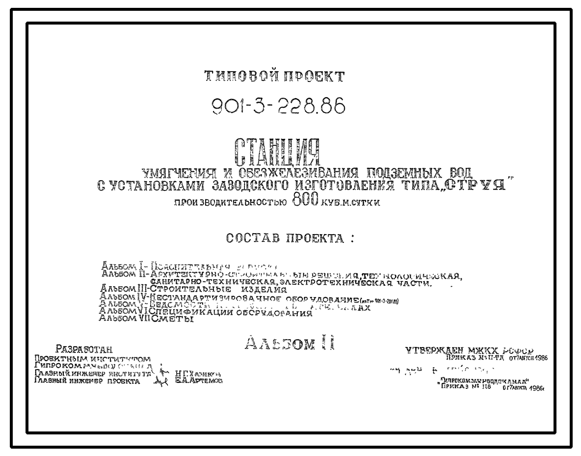 Типовой проект 901-3-228.86 Станция умягчения и обезжелезивания подземных вод с установкой заводского изготовления типа “Струя” производительностью 800 м3/сут