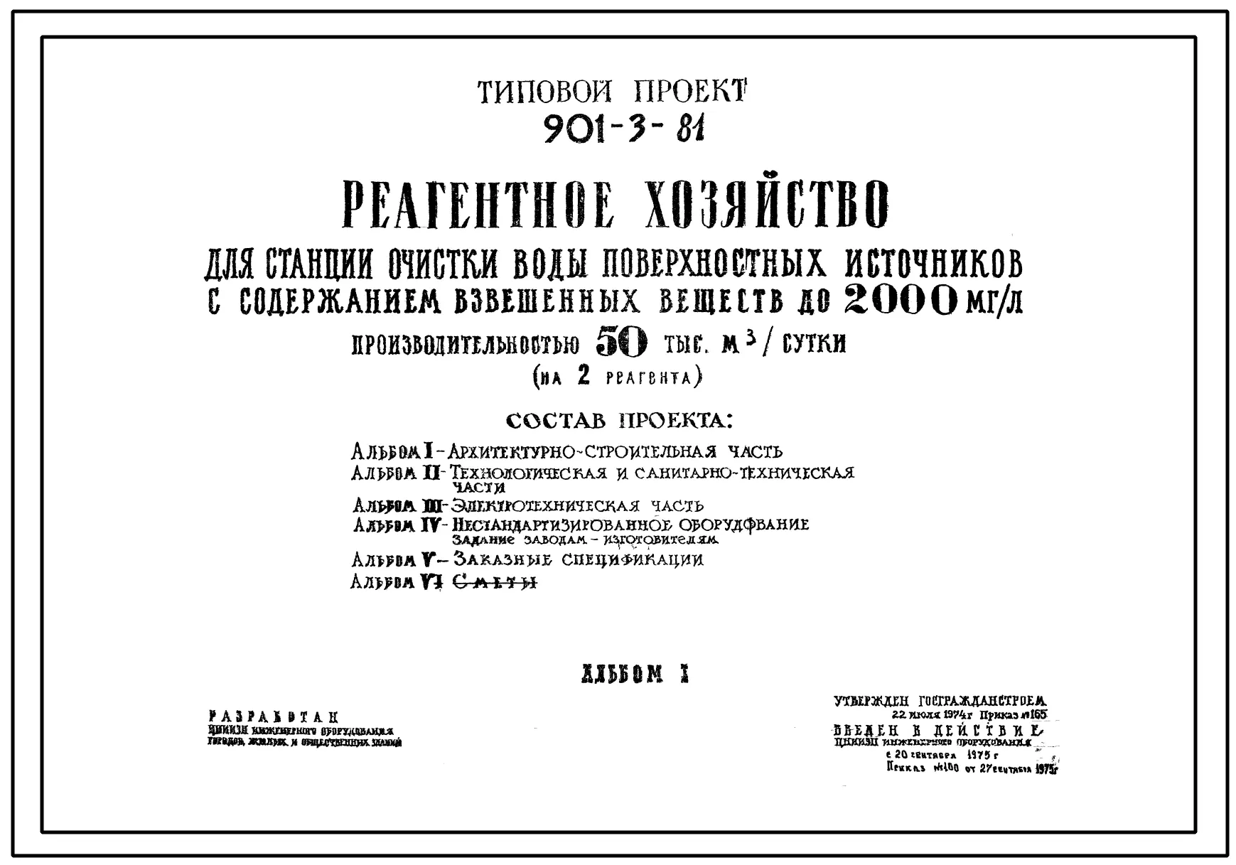 Типовой проект 901-3-81 Реагентное хозяйство для станции очистки воды поверхностных источников с содержанием взвешенных веществ до 2000 мг/л производительностью 50 тыс. м3/сутки (на 2 реагента)