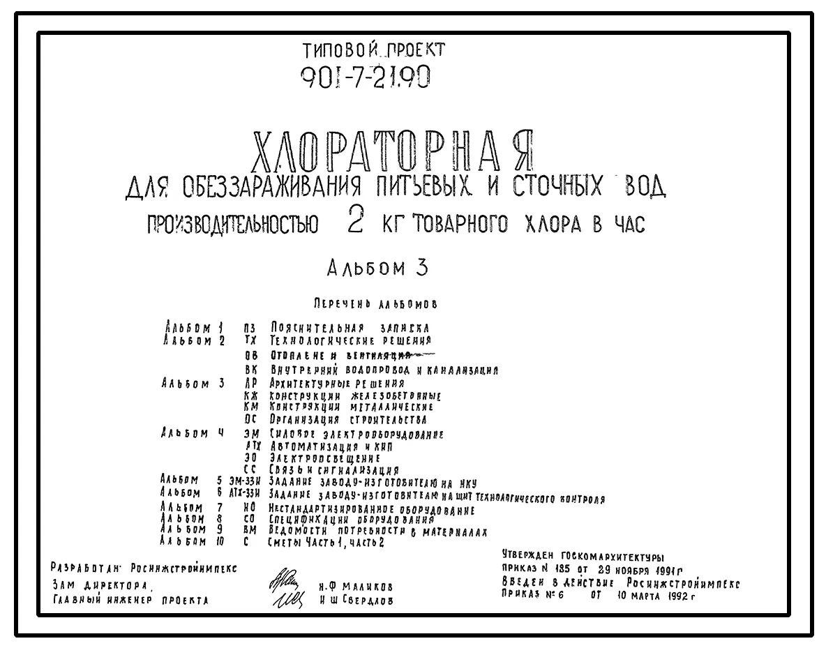 Типовой проект 901-7-21.90 Хлораторная для обеззараживания питьевых и сточных вод производительностью 2 кг товарного хлора в час