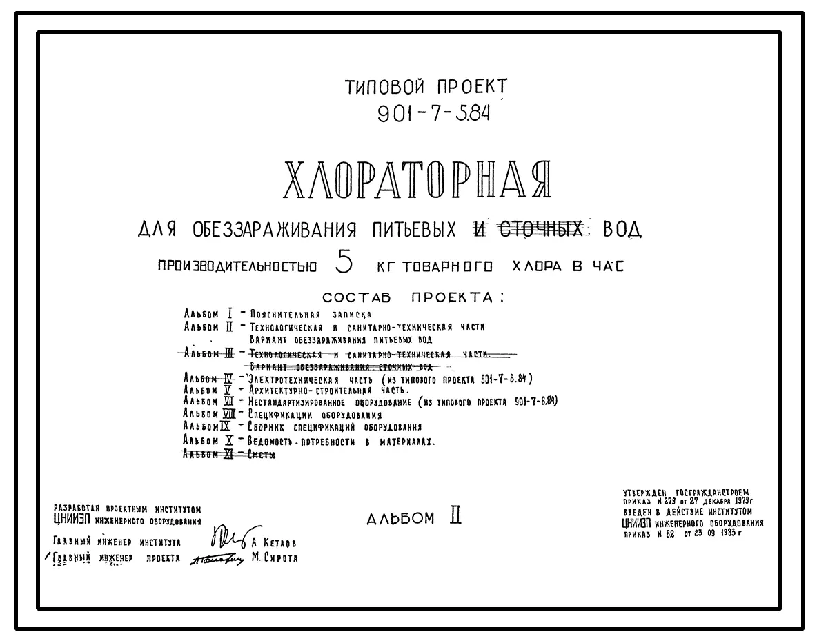 Типовой проект 901-7-5.84 Хлораторная для обеззараживания питьевых и сточных вод производительностью 5 кг товарного хлора в час
