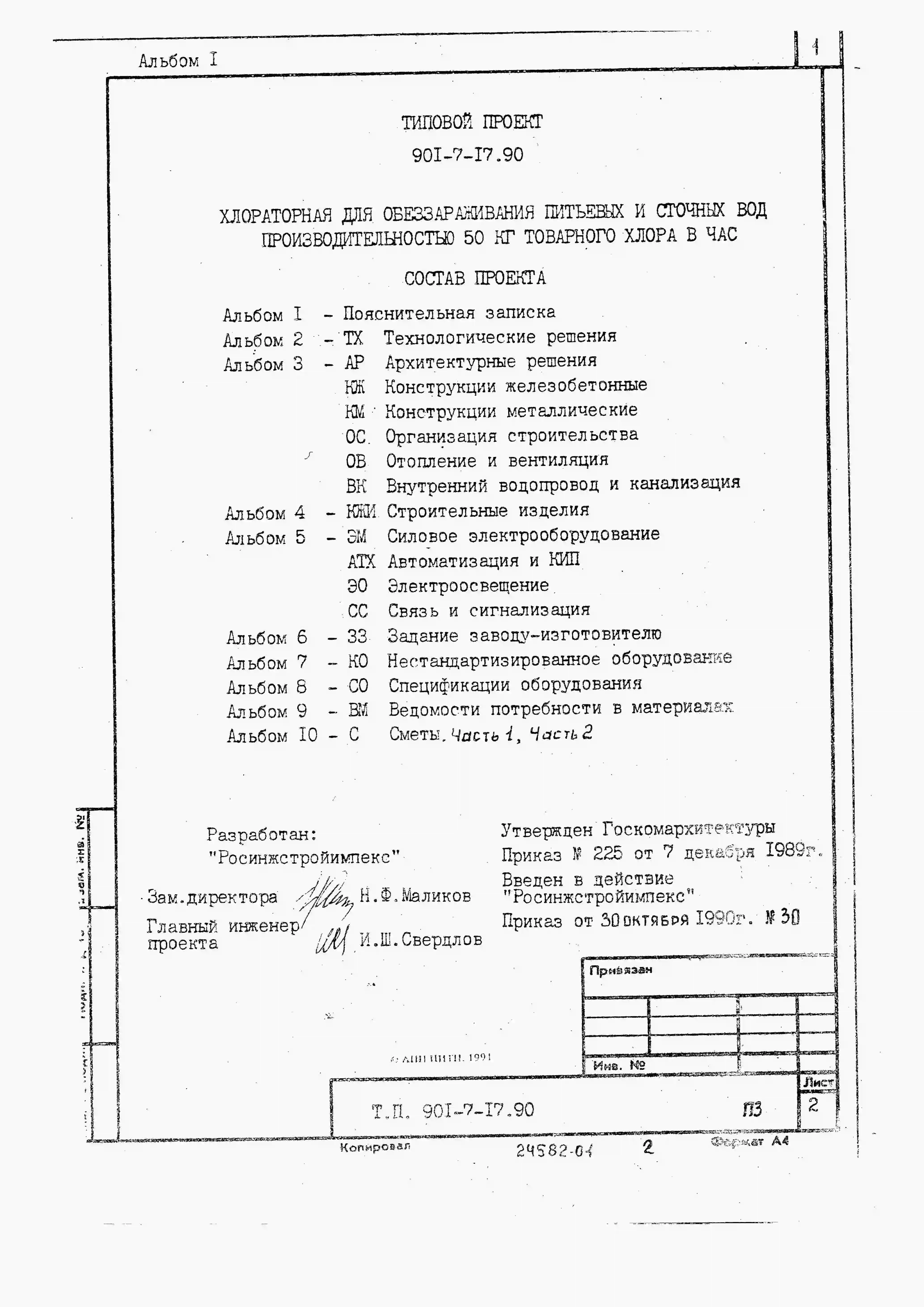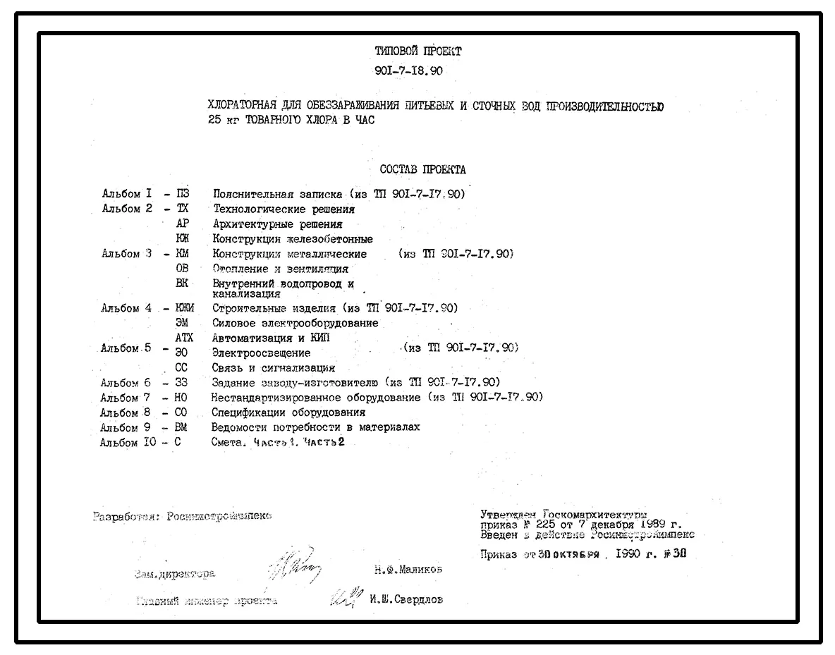 Типовой проект 901-7-18.90 Хлораторная для обеззараживания питьевых и сточных вод производительностью 25 кг товарного хлора в час