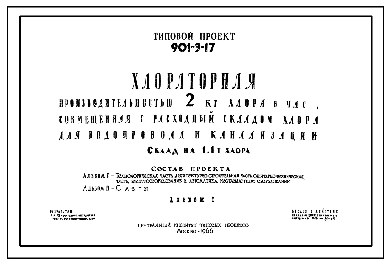 Типовой проект 901-3-17 Хлораторная производительностью 2 кг хлора в час, совмещенная с расходным складом хлора, для водопровода и канализации. Склад на 1,1 т хлора.