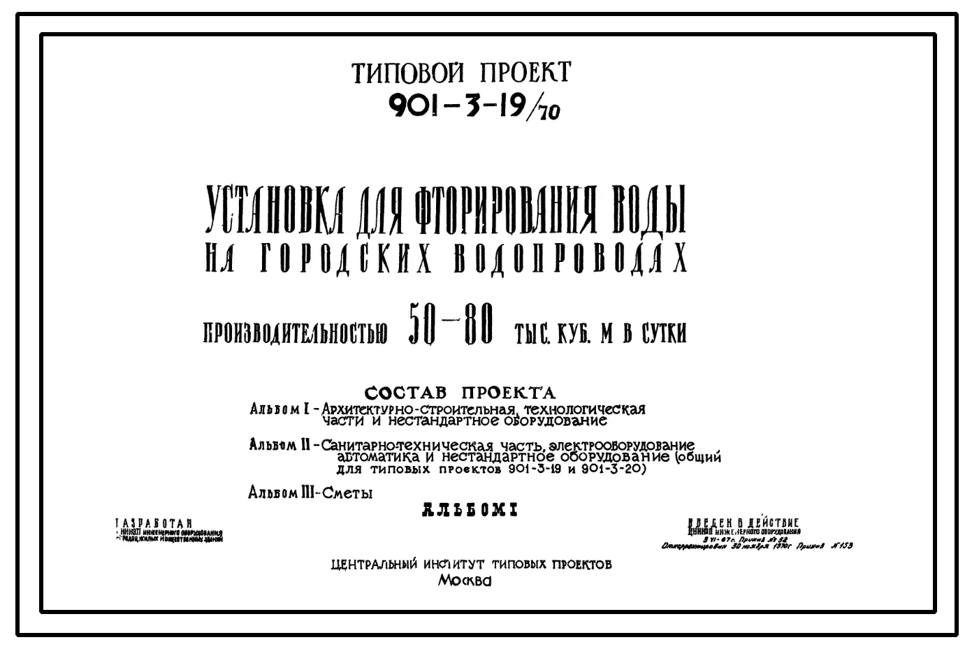Типовой проект 901-3-19/70 Установка для фторирования воды на городских водопроводах производительностью 50-80 тыс.м3/сутки.