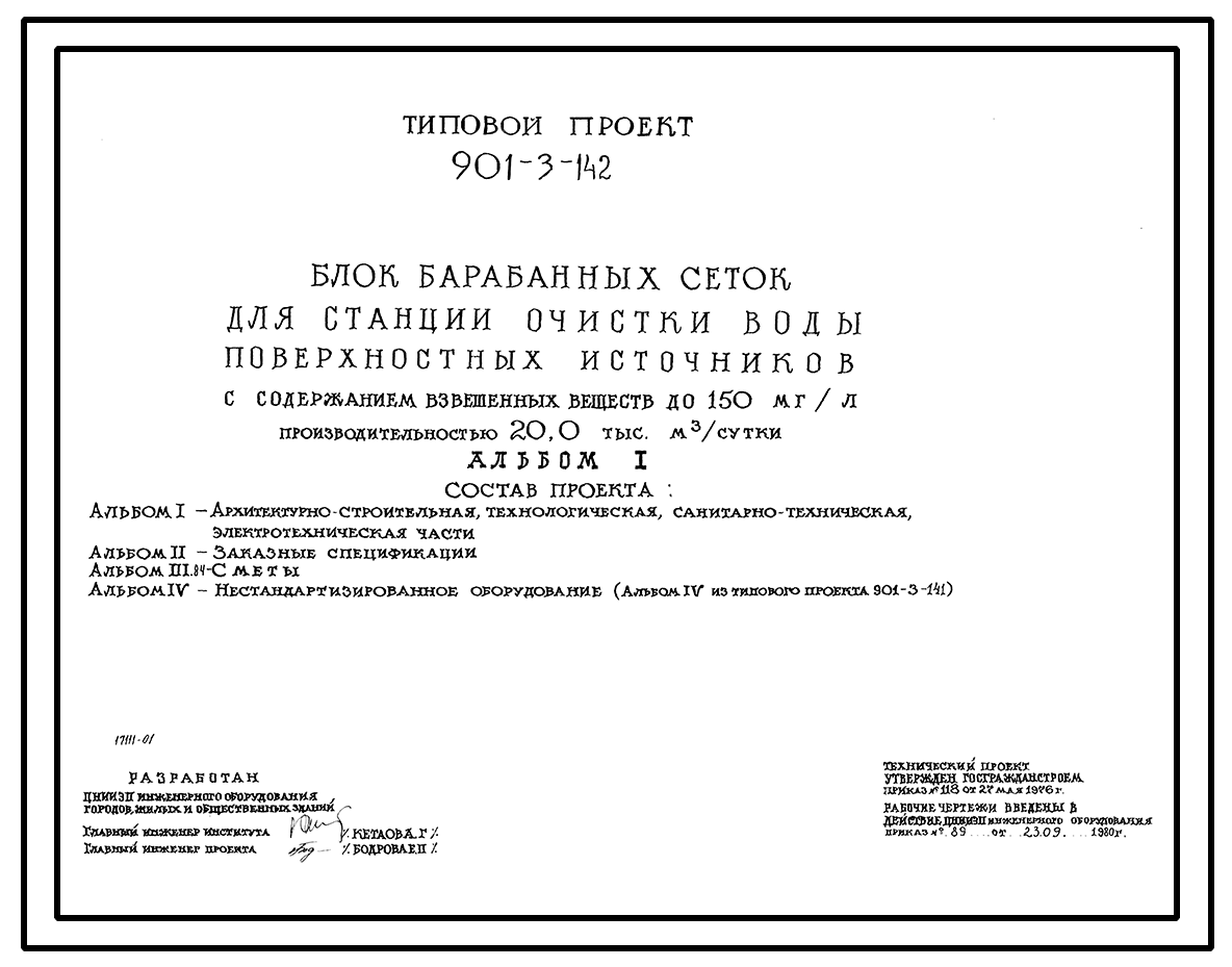 Типовой проект 901-3-142 Блок барабанных сеток для станции очистки воды поверхностных источников с содержанием взвешенных веществ до 150 мг/л производительностью 20,0 тыс. м3/сутки